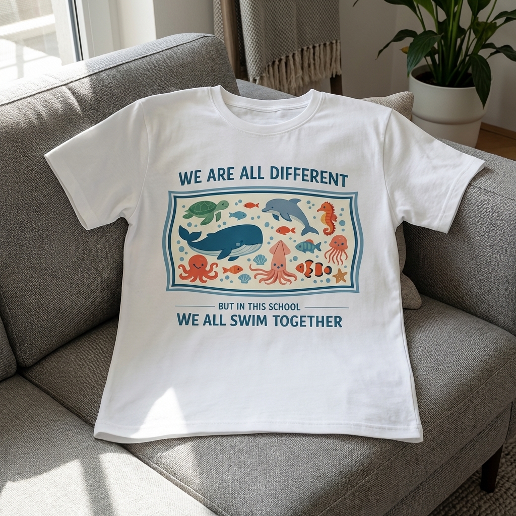 The phrase "We Are All Different But In This School We All Swim Together" is a metaphor for diversity and inclusion within an educational or communal environment. It emphasizes that while individuals may have unique qualities, they are united by a shared space and purpose, fostering a sense of community and acceptance.