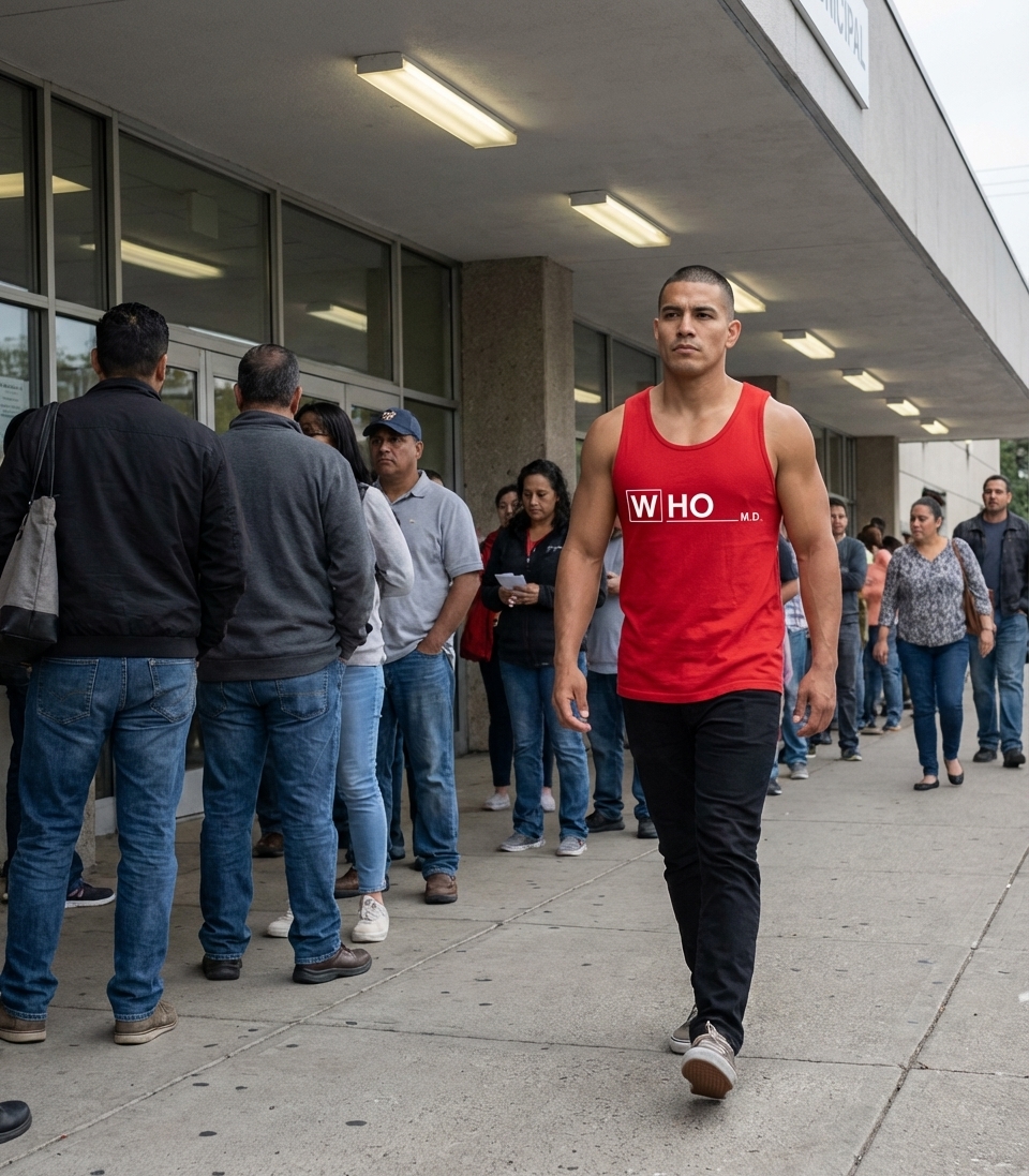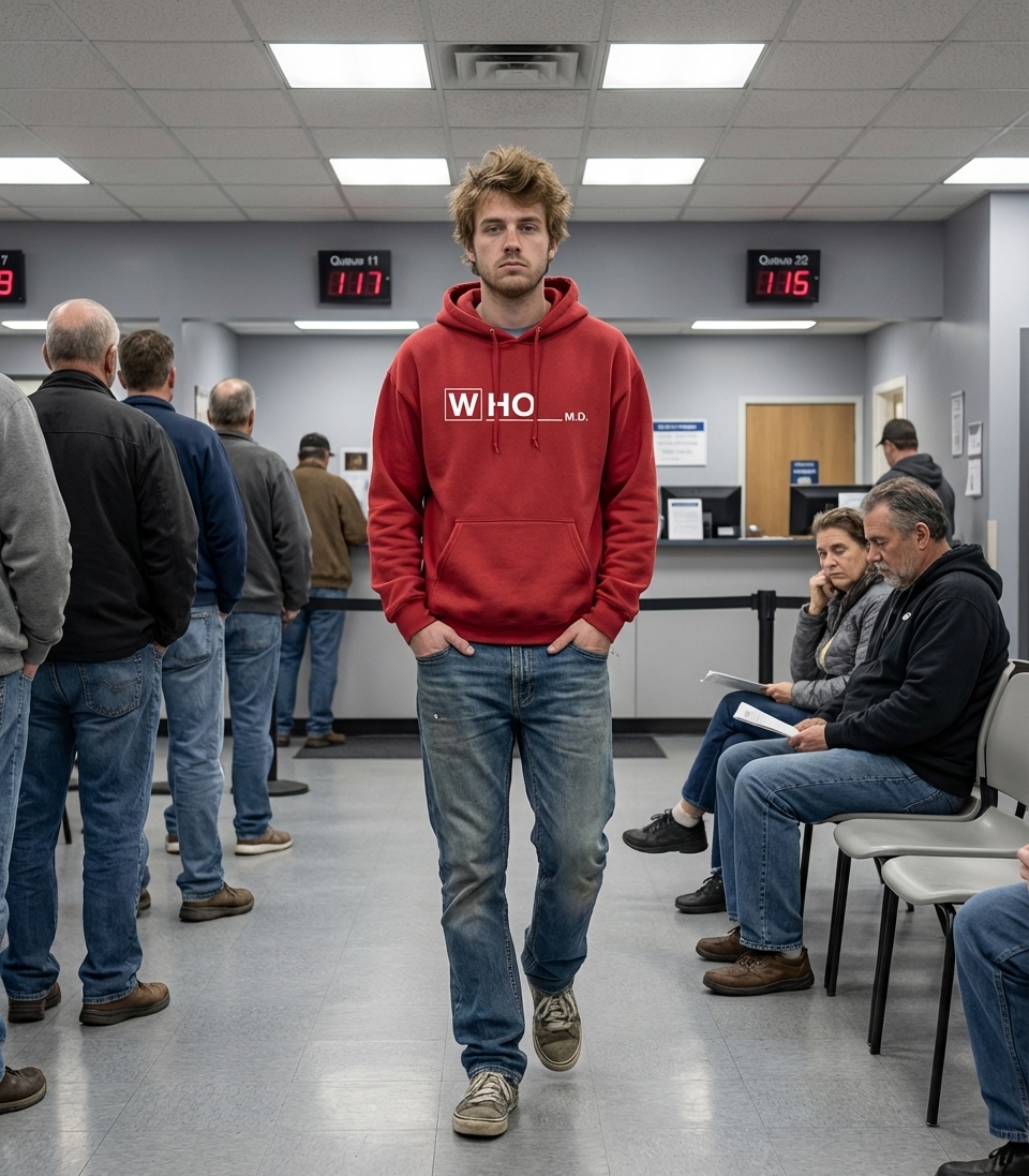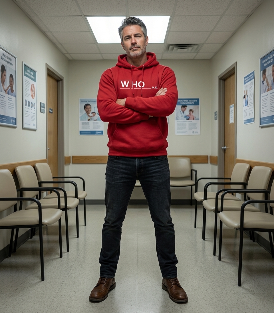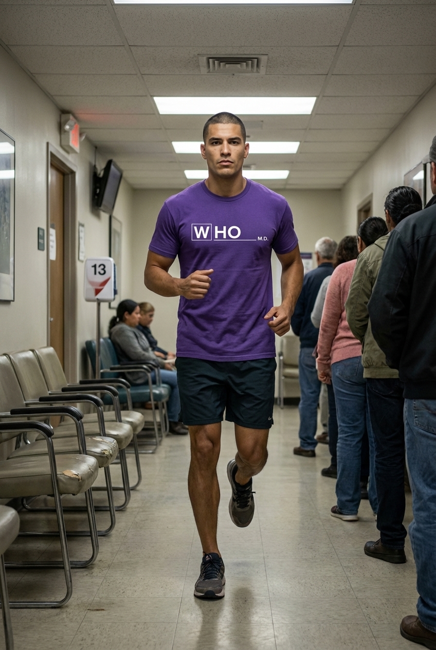 The phrase 'W HO____ M.D.' cleverly plays on the title 'Doctor Who', with 'W' in a box and 'HO' underlined, echoing the show's recognizable logo. The addition of 'M.D.' (Medical Doctor) turns it into a pun that suggests a medical professional who embodies the spirit of the time-traveling Doctor.