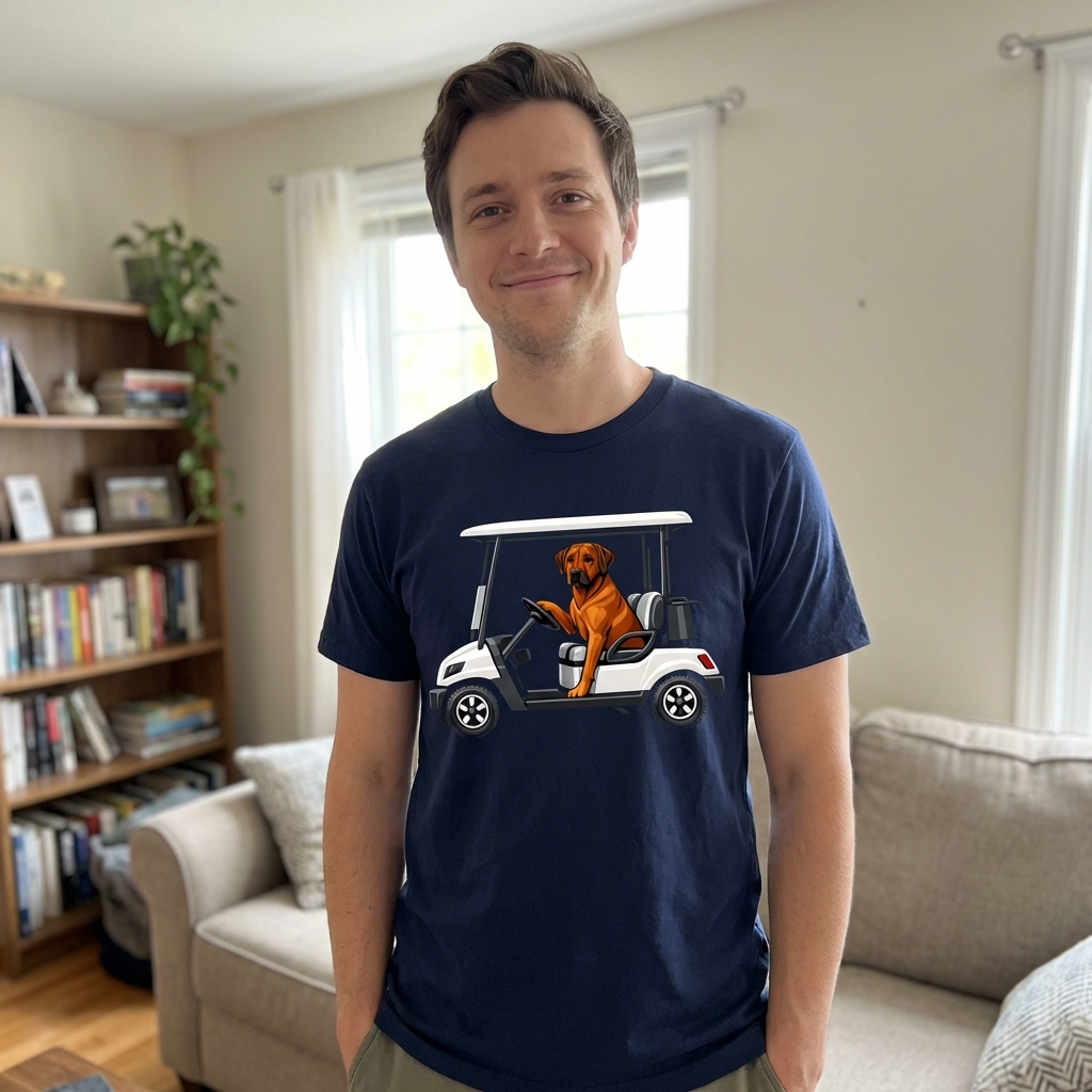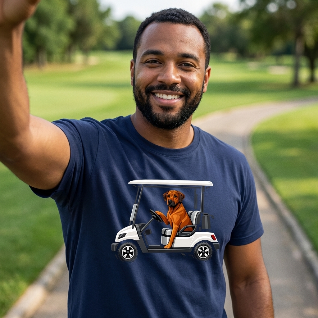 This whimsical graphic features a confident brown dog, resembling a Rhodesian Ridgeback, behind the wheel of a classic white golf cart. The artwork is presented in a clean, flat style, making it a charming and eye-catching image. It combines beloved pets with a popular outdoor activity in a humorous way.