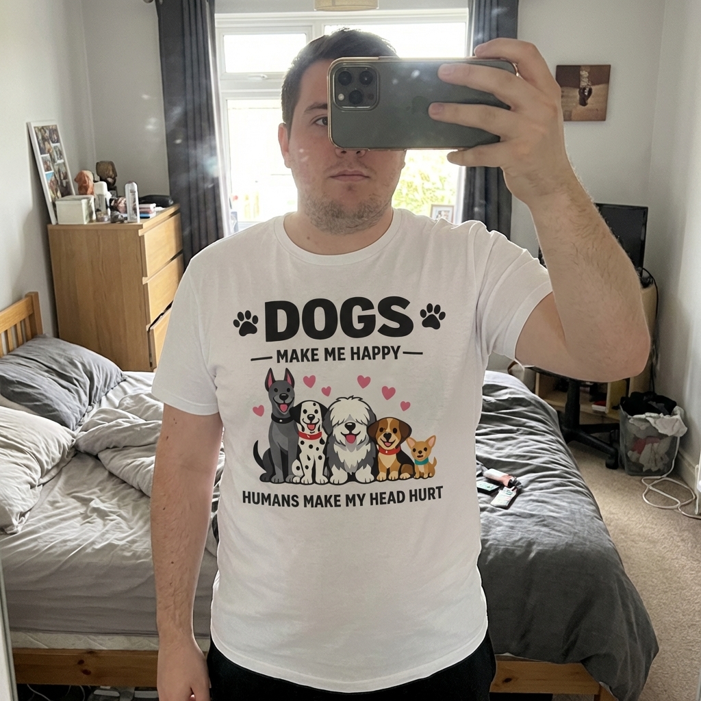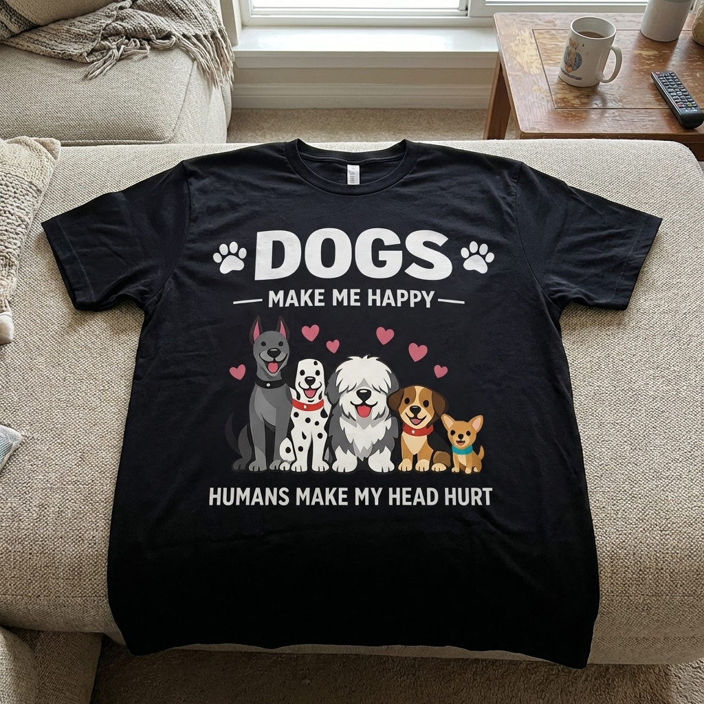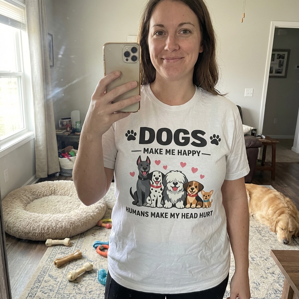 Okay, so this "Dogs Make Me Happy" shirt is actually really good. It's super comfy, and the abstract design looks cool in person—not too in-your-face. Definitely a new favorite for casual days!