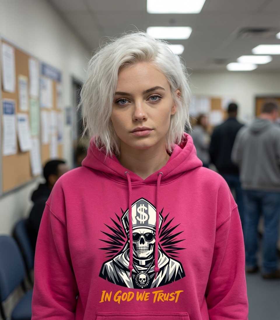 This satirical design speaks to individuals who question the intersection of faith, wealth, and power in modern society.