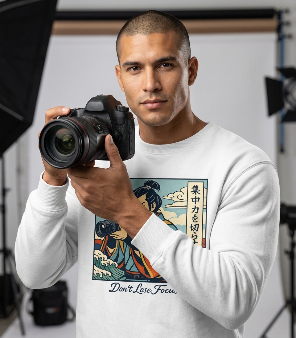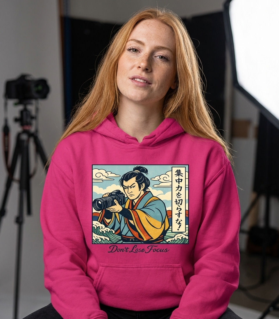 The 'Don't Lose Focus' phrase captures the lifestyle of passionate photographers who meticulously frame shots, pursue artistic vision, and maintain sharp concentration.
