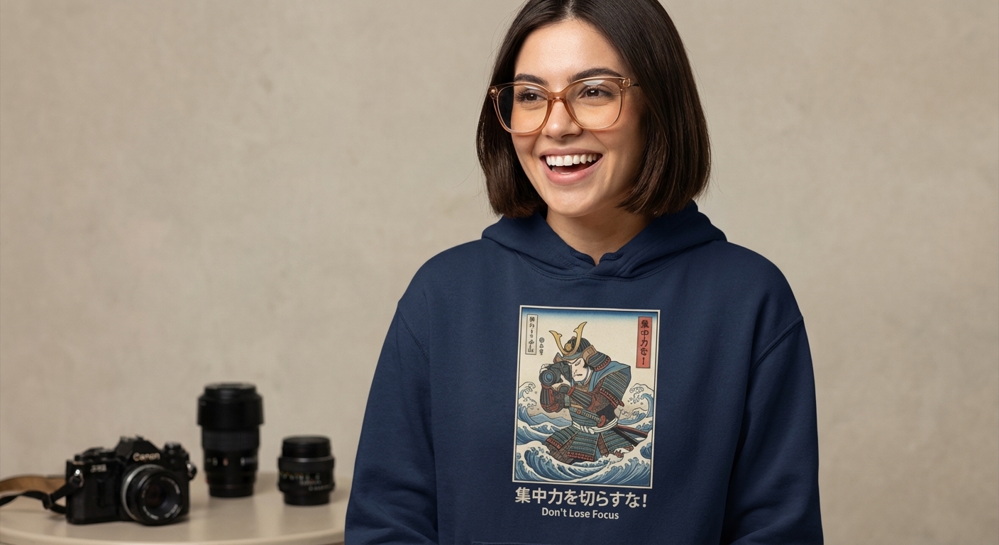 This unique graphic features a determined samurai warrior, rendered in a traditional Japanese Ukiyo-e art style, holding a modern DSLR camera with a telephoto lens. The detailed illustration combines ancient aesthetics with contemporary technology, creating a striking visual.