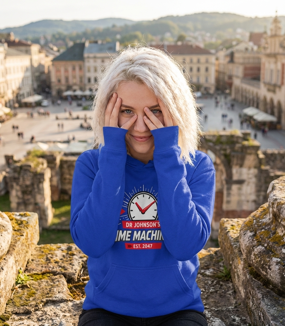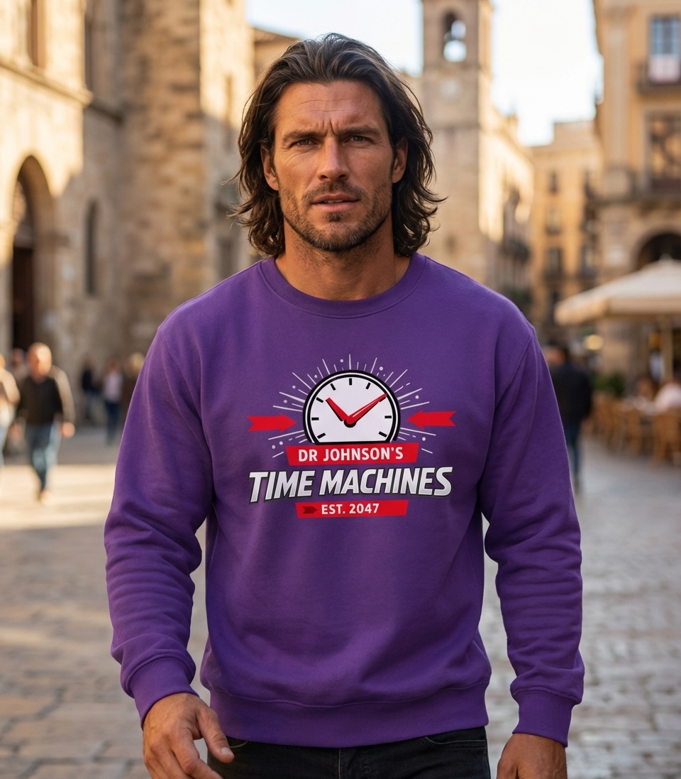 The phrase "Dr Johnson's Time Machines" playfully suggests a business specializing in temporal displacement devices. It taps into the popular sci-fi trope of time travel, inviting imagination about journeys to the past or future. The "Est. 2047" adds a specific, futuristic establishment date, anchoring the concept in a plausible timeline.