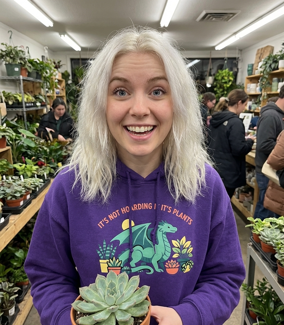 This playful design features a charming teal dragon surrounded by an array of potted plants and succulents. The whimsical artwork captures the essence of a plant enthusiast's joyful obsession with greenery, guarded by a creature known for treasuring its possessions.