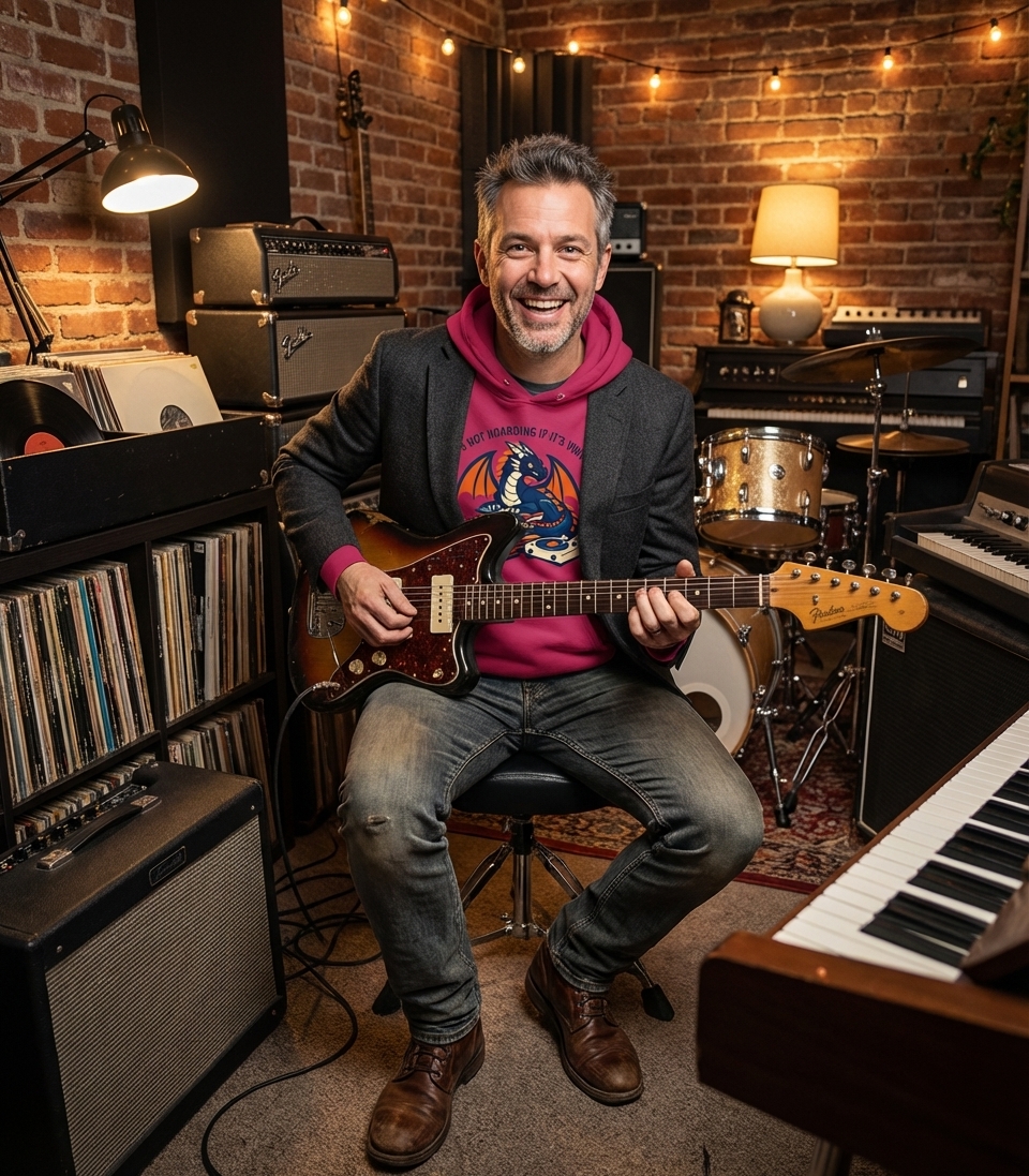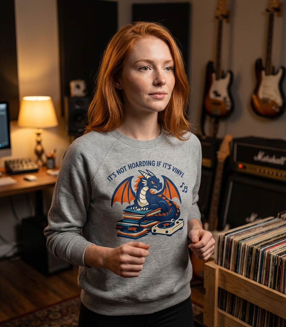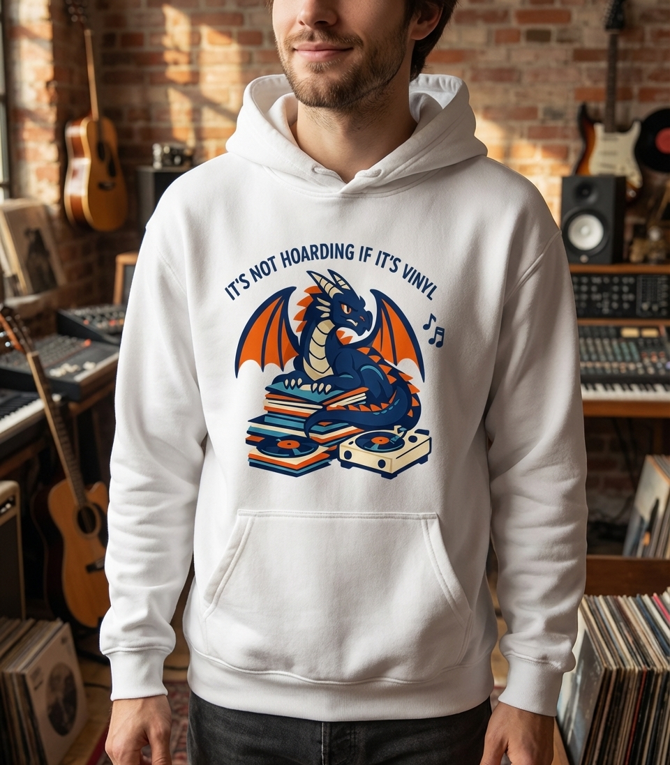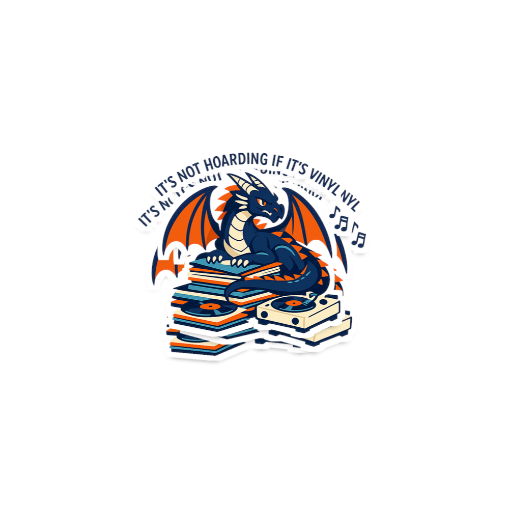This graphic features a stylized blue dragon, complete with orange wings and spikes, confidently perched atop a formidable stack of colorful vinyl records. Flanked by classic turntables and floating music notes, the dragon embodies the spirit of a dedicated music enthusiast. The design playfully suggests that an extensive collection is a treasure, not an excess.