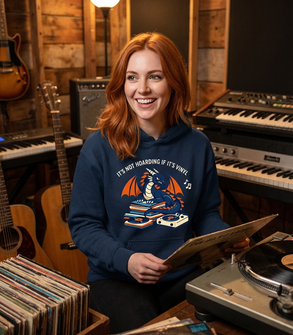 The 'It's Not Hoarding If It's Vinyl' phrase captures the lifestyle of passionate music enthusiasts who spend their days curating records, enjoying classic tunes, and celebrating their extensive collections.