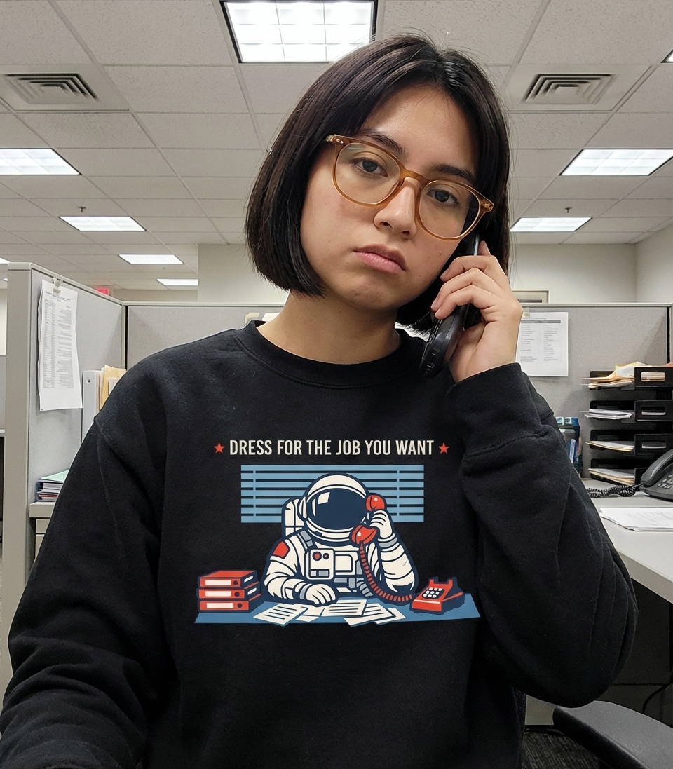 The core phrase, "Dress For The Job You Want," is a common motivational adage for career advancement. Here, it is taken literally and humorously, suggesting that if one's dream job is an astronaut, then a spacesuit is appropriate office attire, regardless of the current workplace.
