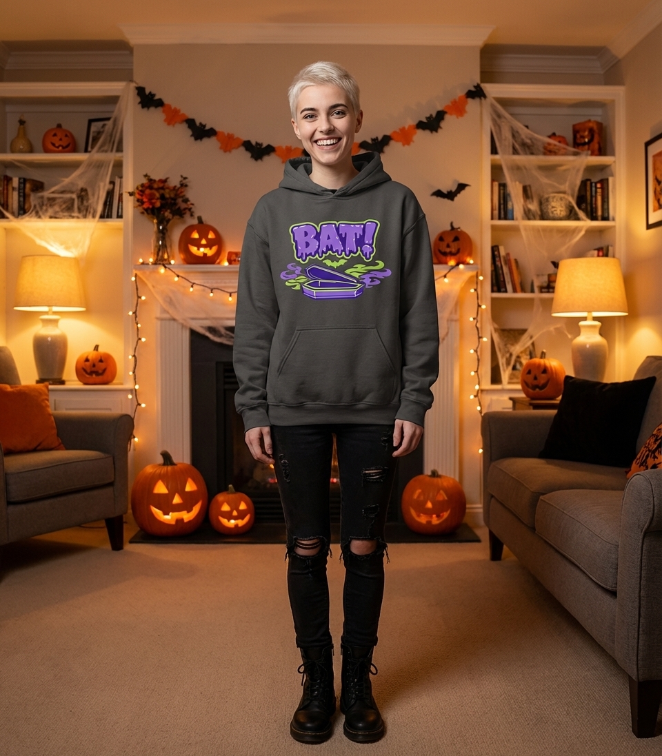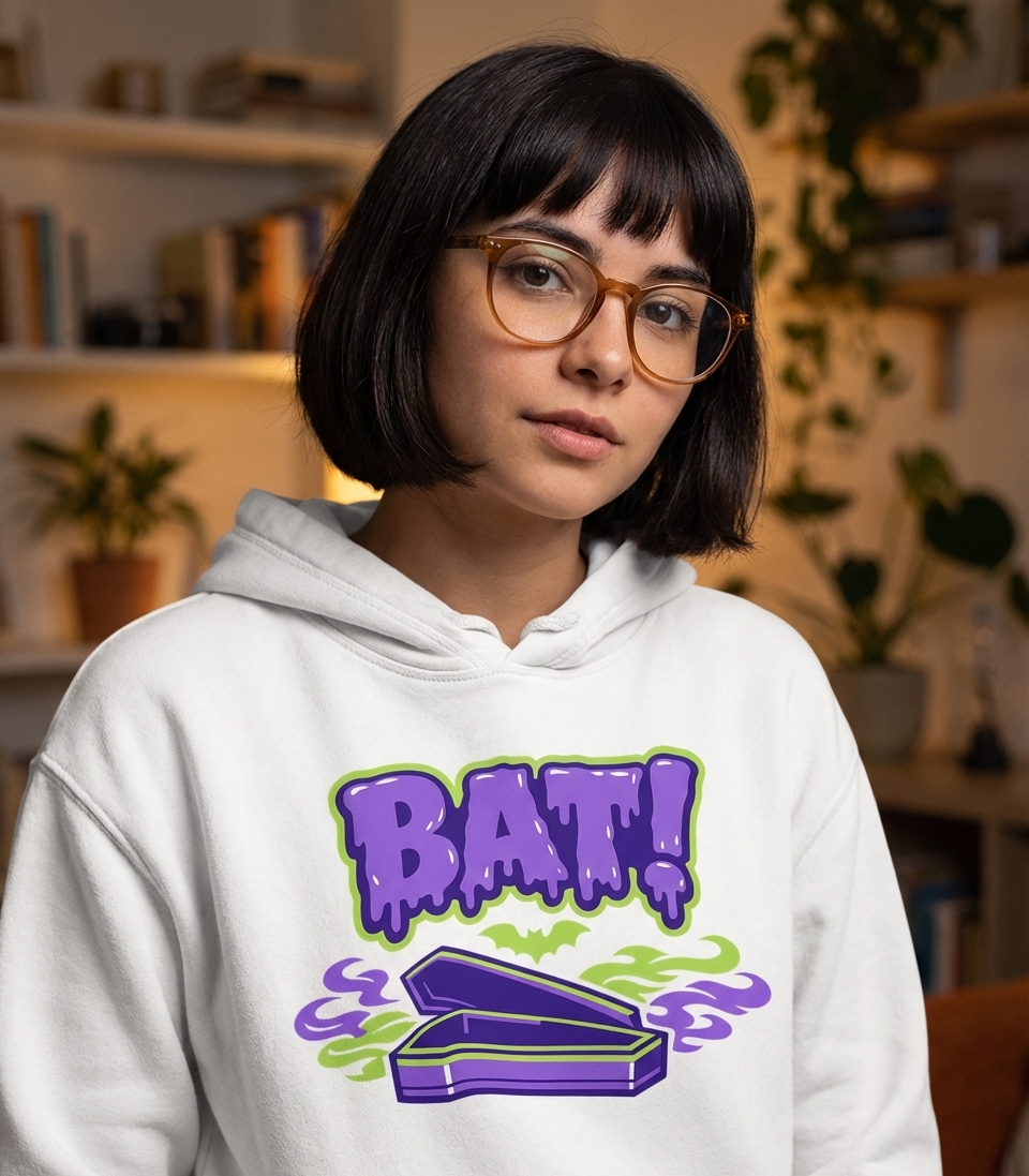 The exclamation "BAT!" playfully captures the sudden appearance or essence of a bat, a classic symbol of Halloween and gothic culture. It evokes the mystery and nocturnal nature associated with these creatures, often linked to vampires and spooky tales. The drippy font adds a monstrous, fun horror element to the simple word.