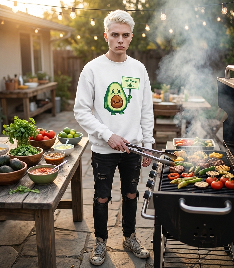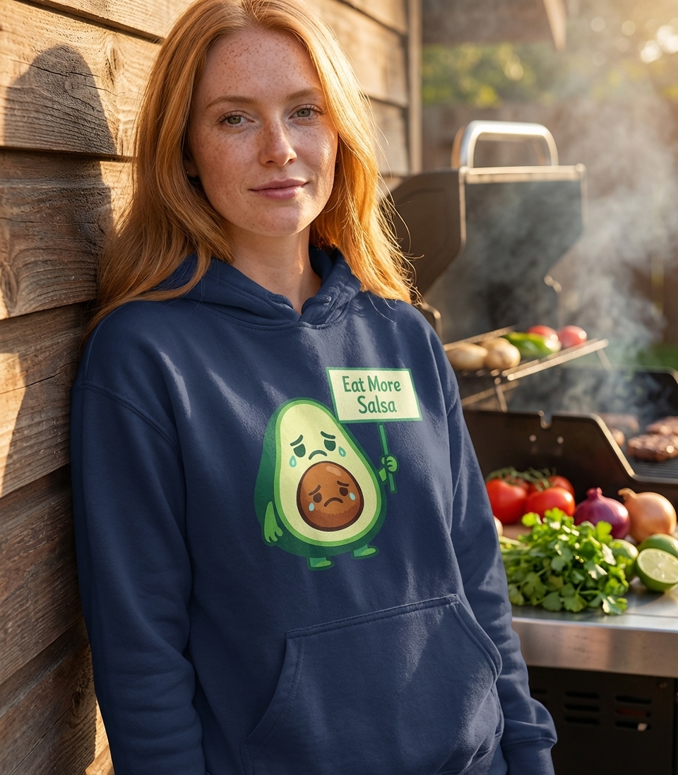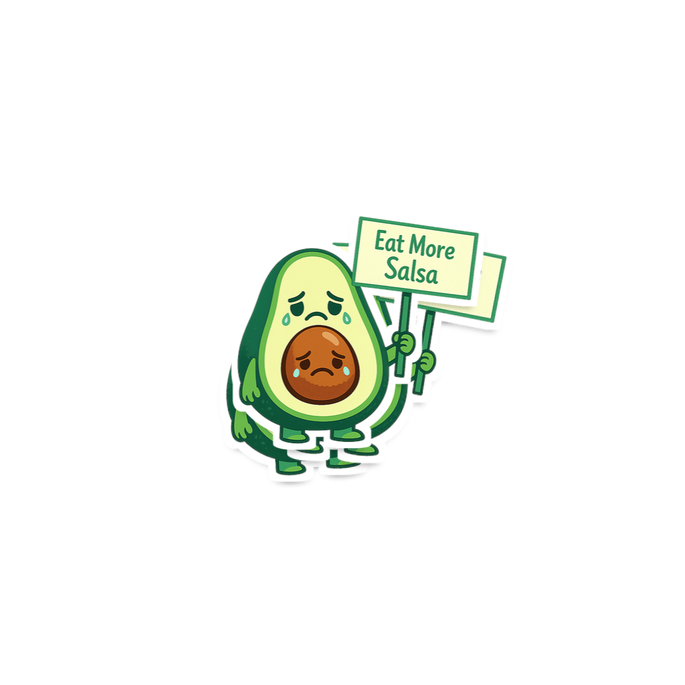 The design playfully personifies the avocado, making a lighthearted statement about the importance and deliciousness of salsa in any meal or snack.