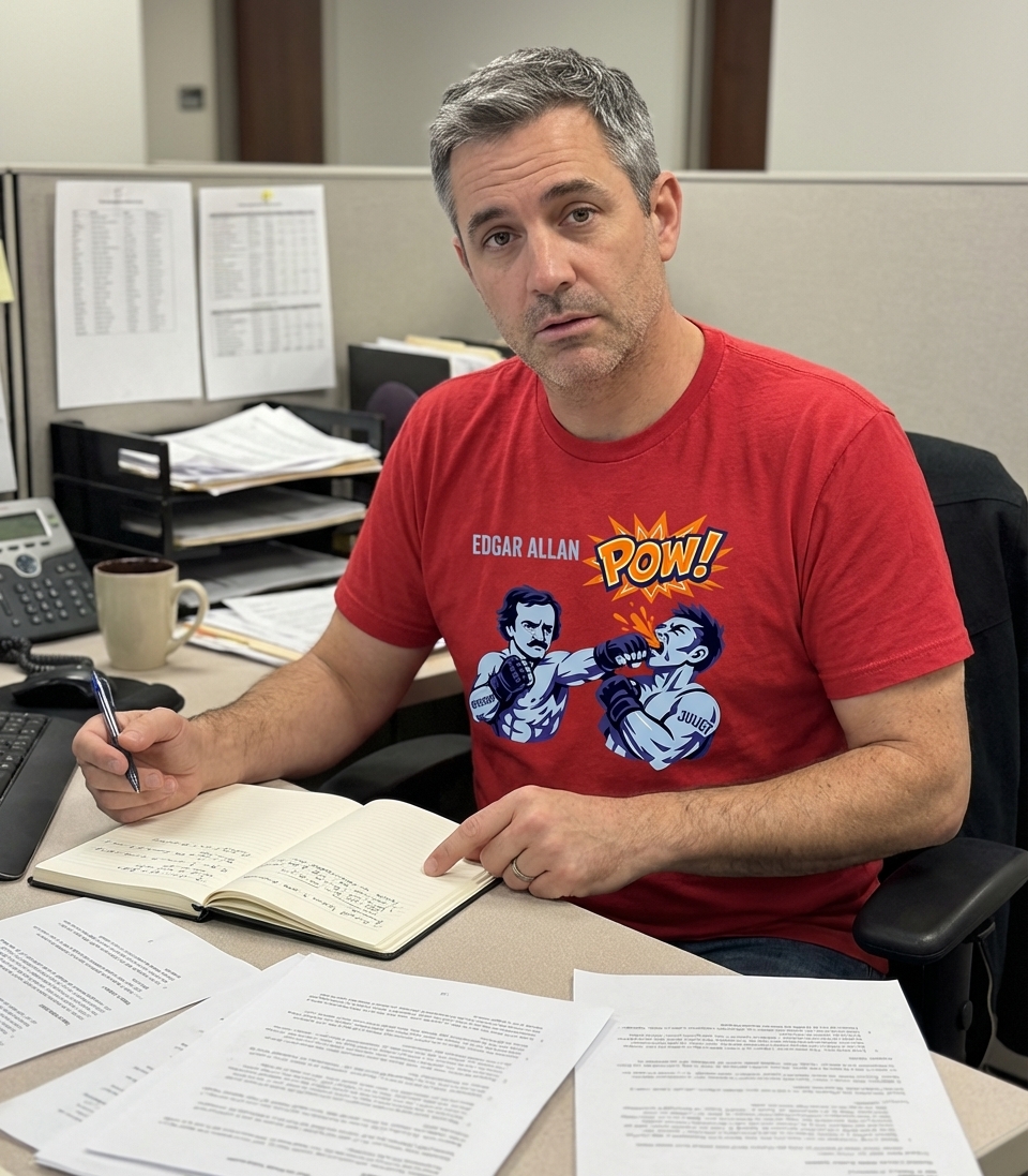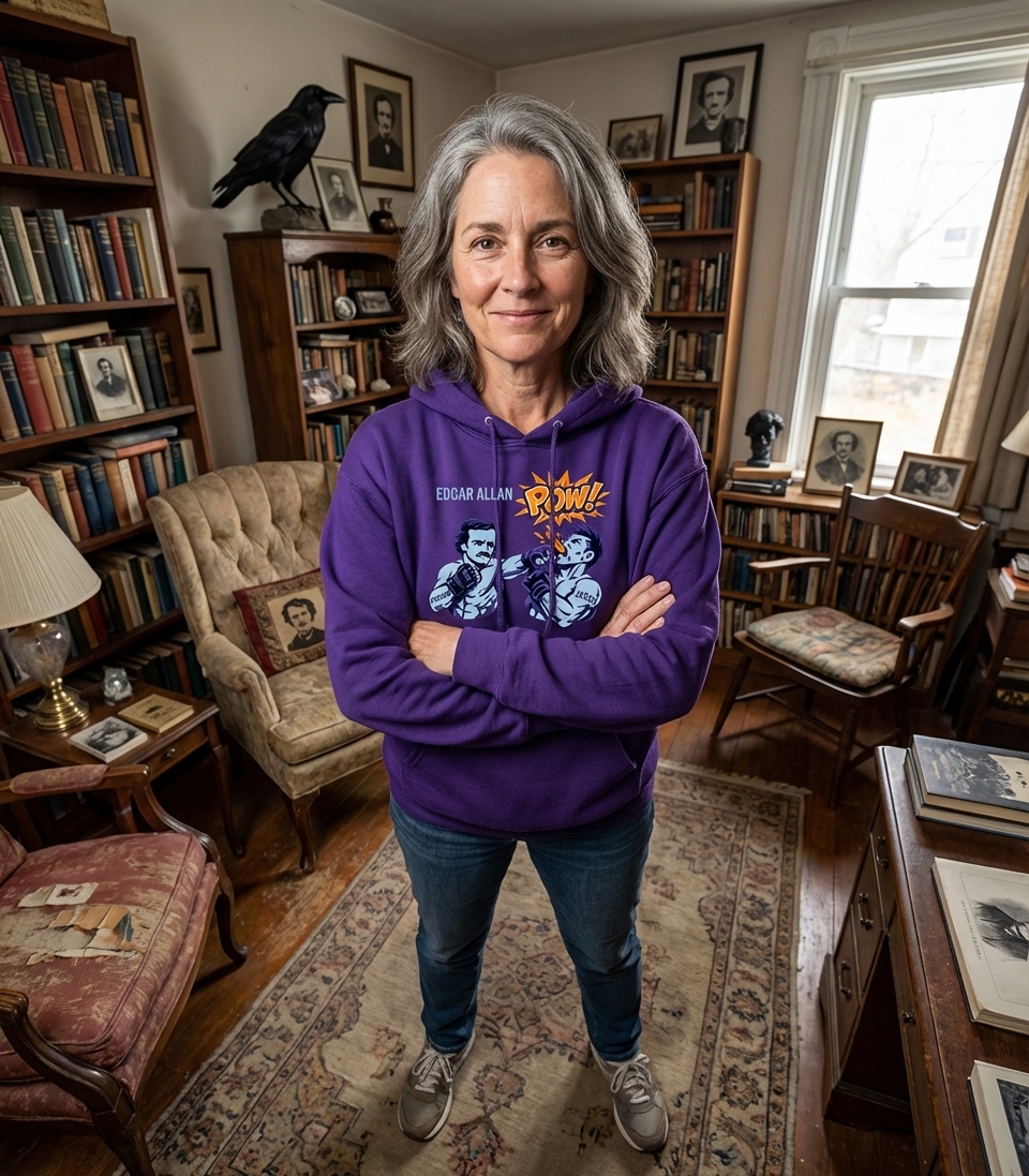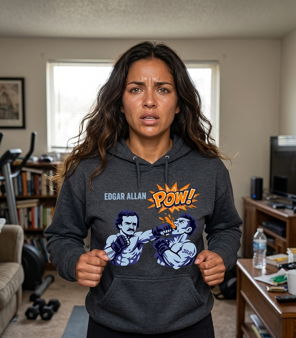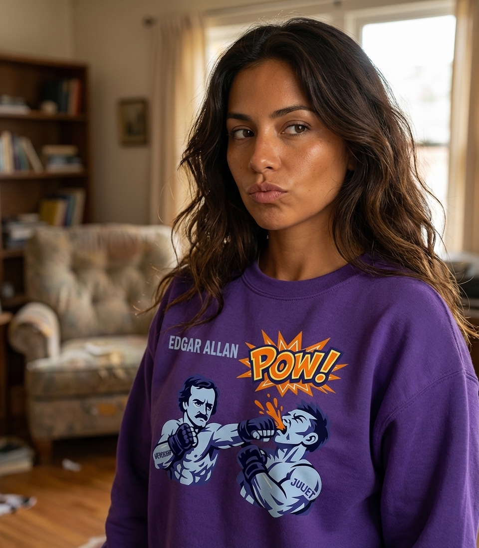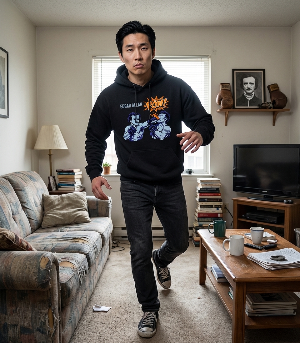 This unique graphic features literary master Edgar Allan Poe as a formidable boxer, delivering a powerful punch. The dynamic artwork combines classic literature with comic book action, creating a fun and unexpected visual.