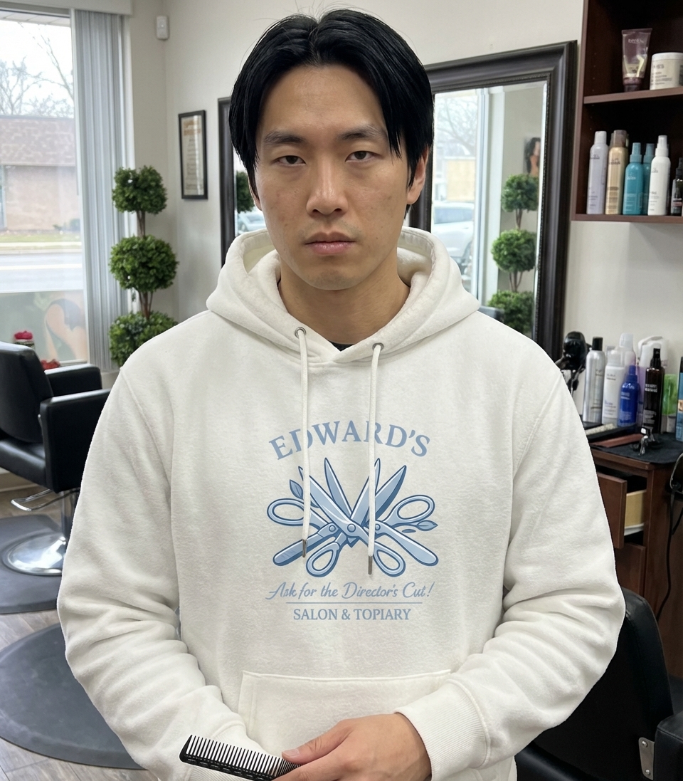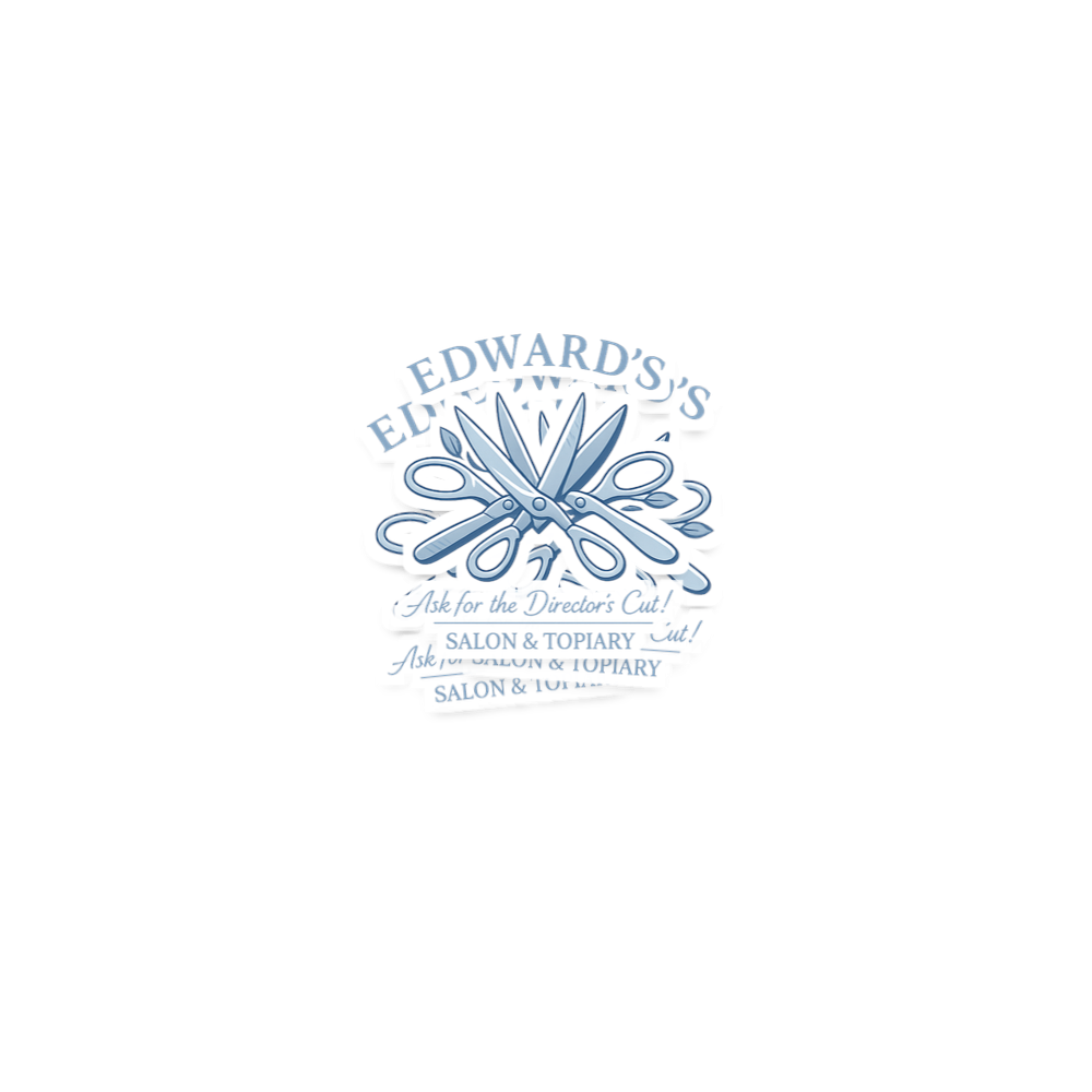 The phrase "Ask for the Director's Cut!" is a playful nod to the film industry, transforming a common cinematic term into a clever salon offering. Combined with "Edward's Salon & Topiary," it creates a direct and humorous homage to a beloved fictional character known for their unique hairdressing and gardening skills.