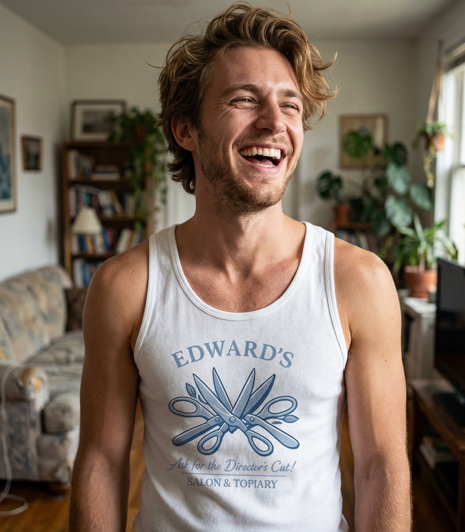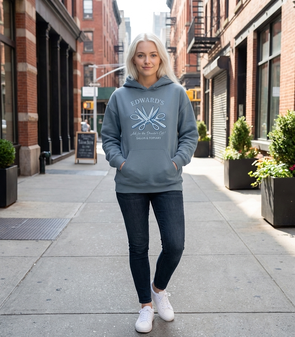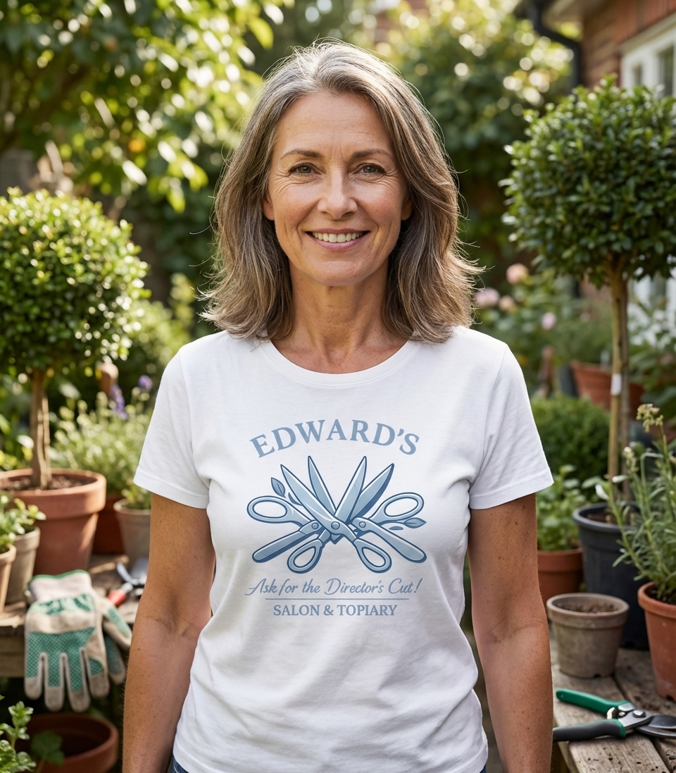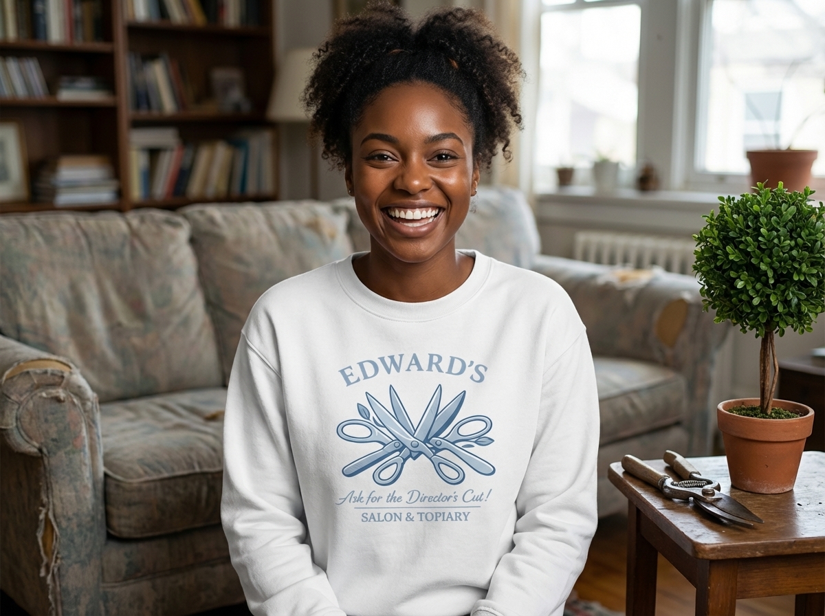The "Edward's Salon & Topiary" design captures the unique style of film enthusiasts who appreciate gothic charm, witty wordplay, and classic cinematic tributes.