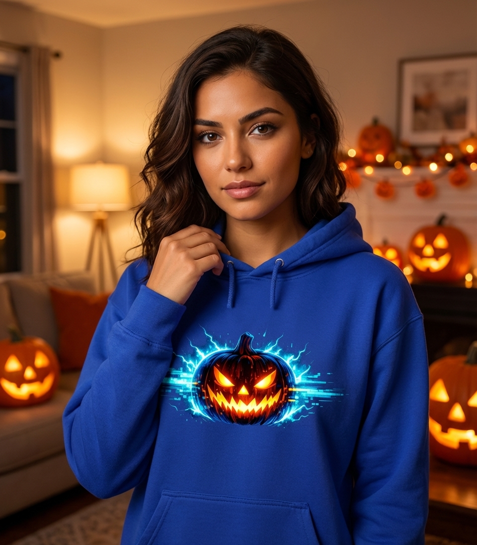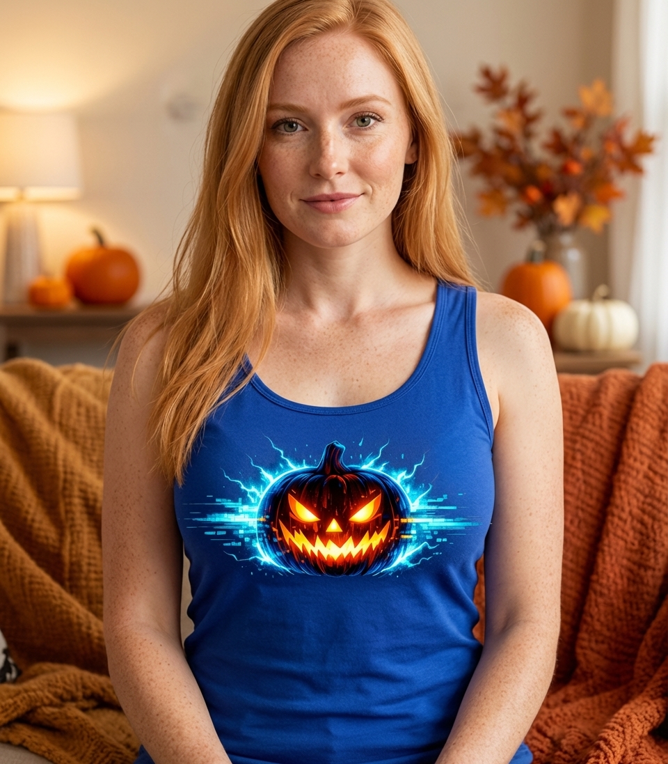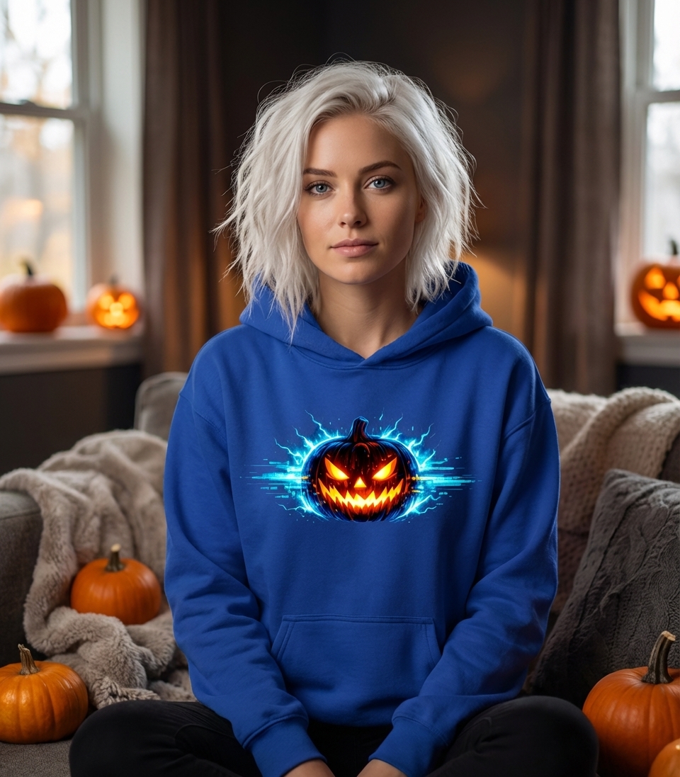 This captivating design features a classic jack-o'-lantern reimagined with a modern, high-tech twist. Glowing with intense orange and yellow light, the pumpkin is surrounded by dynamic electric blue lightning and digital glitch effects, creating a truly unique and energetic visual.