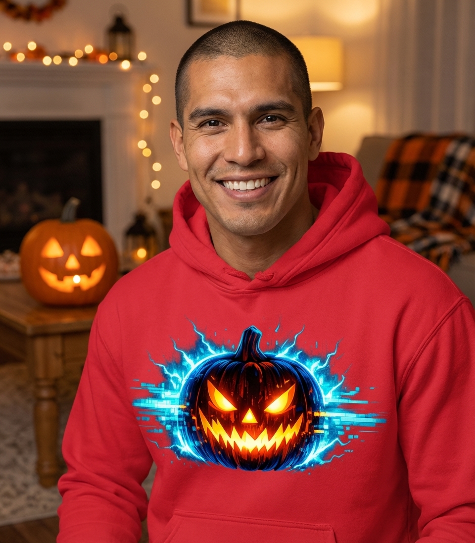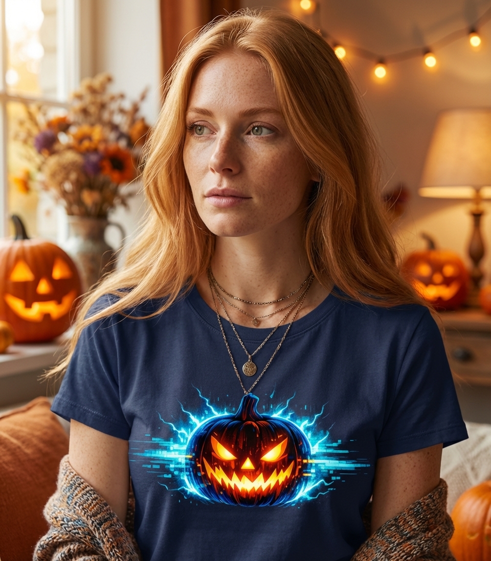 This electric jack-o'-lantern design captures the excitement of modern Halloween enthusiasts who love innovative spooky themes, vibrant digital art, and tech-infused celebrations.