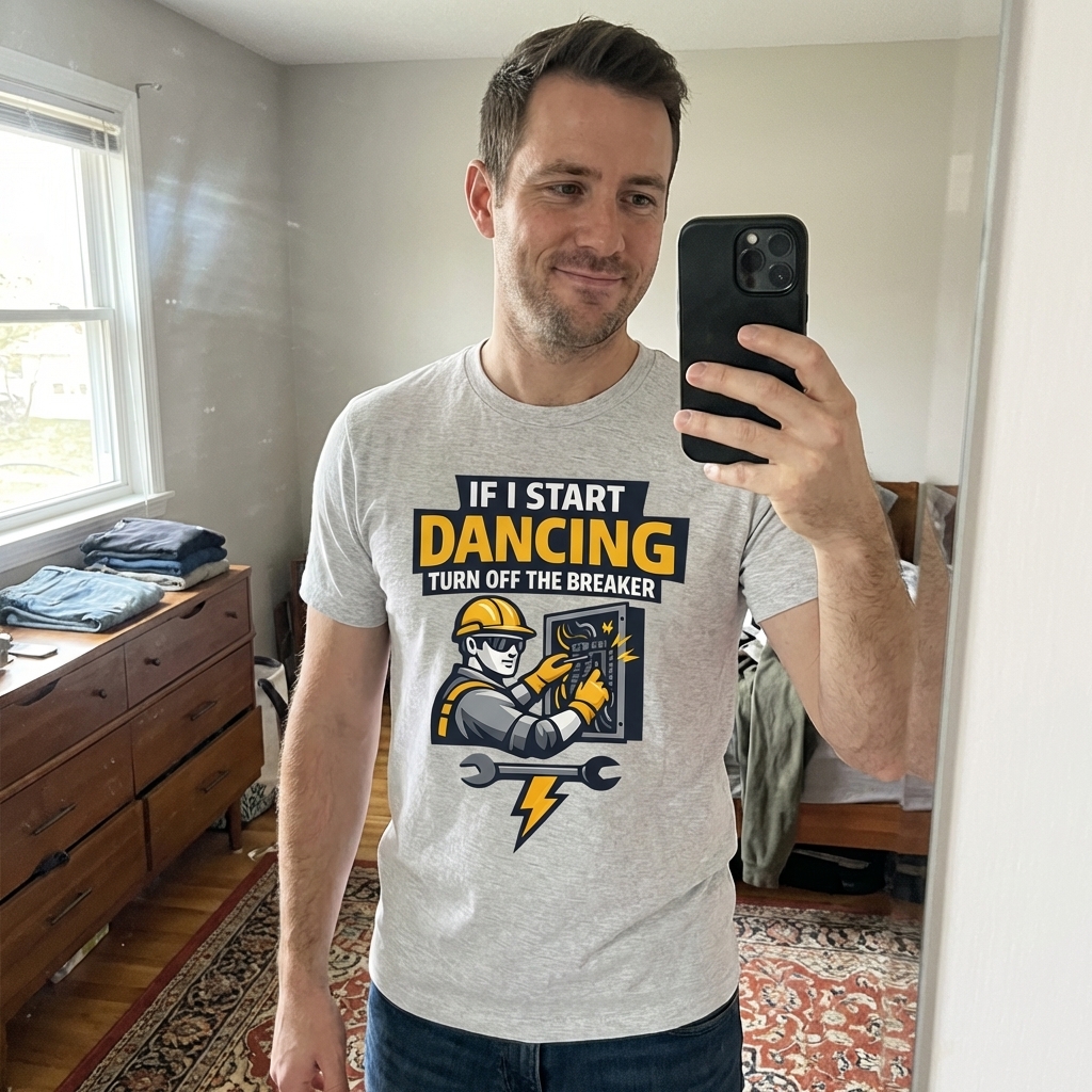 The 'If I Start Dancing Turn Off The Breaker' phrase captures the lifestyle of dedicated electricians who work with high voltage, prioritize safety, and share laughs about their demanding profession.