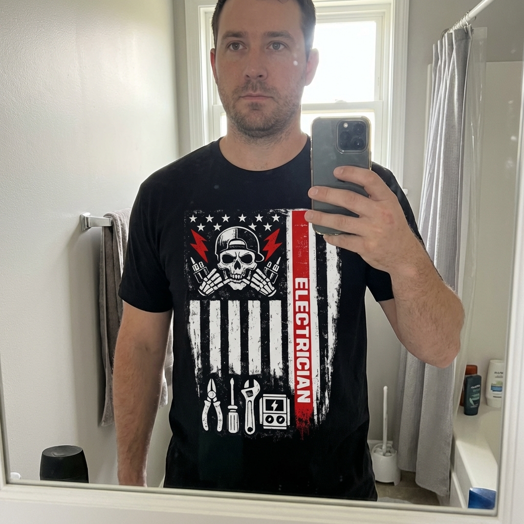 Honestly, really impressed with this one. The electrician skull flag design pops nicely, and the fabric is actually super soft, not stiff at all. Already got a compliment on it, definitely a cool addition to my casual rotation.