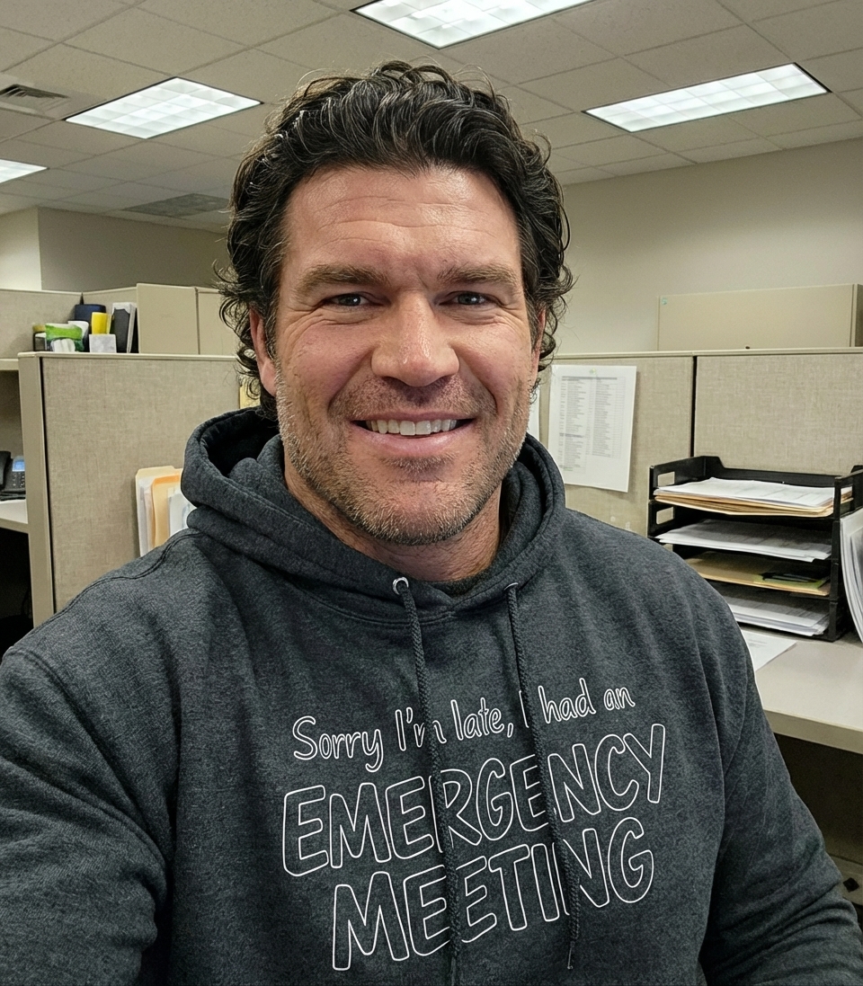 The 'Emergency Meeting' phrase captures the lifestyle of professionals who use humor to lighten daily work stresses and late arrivals.