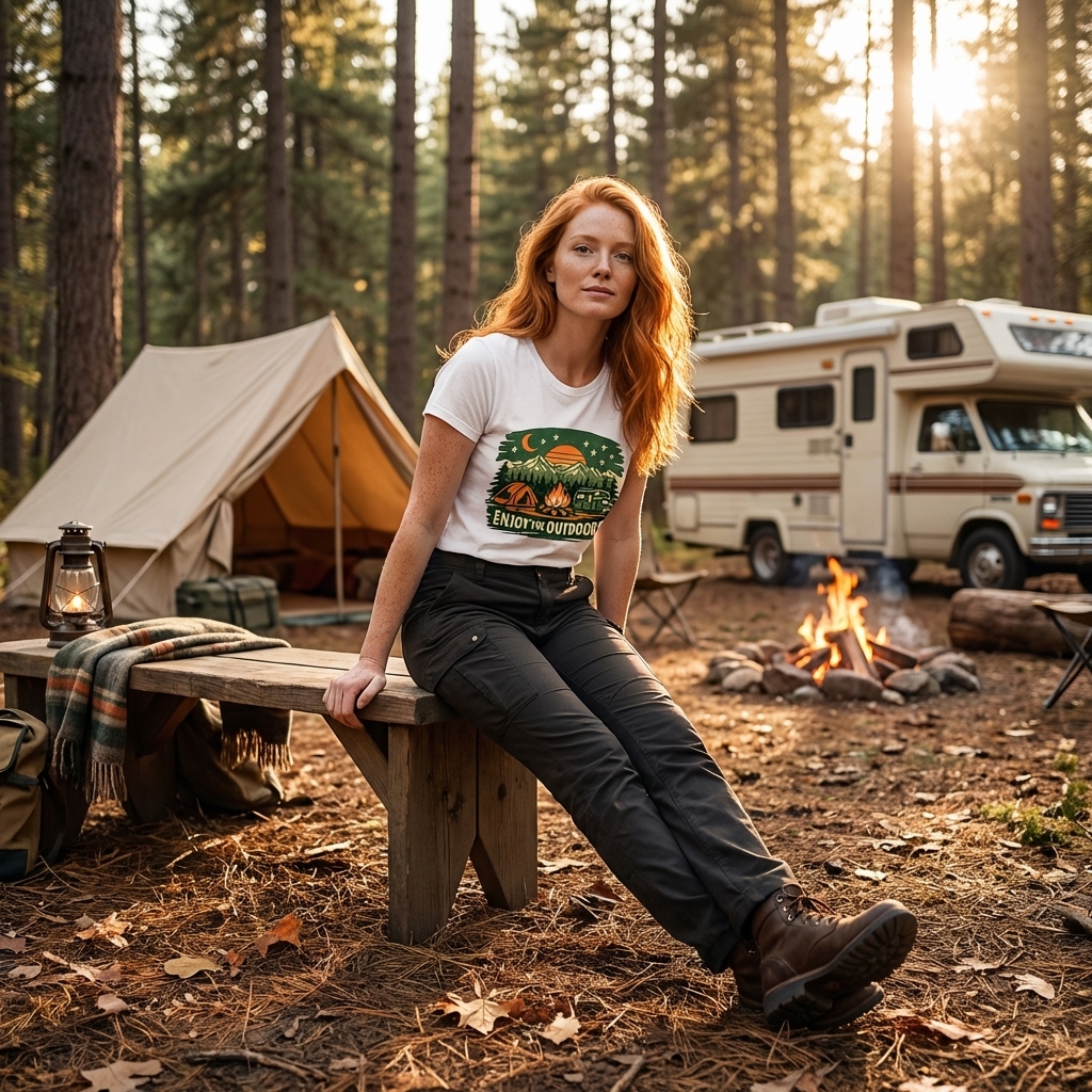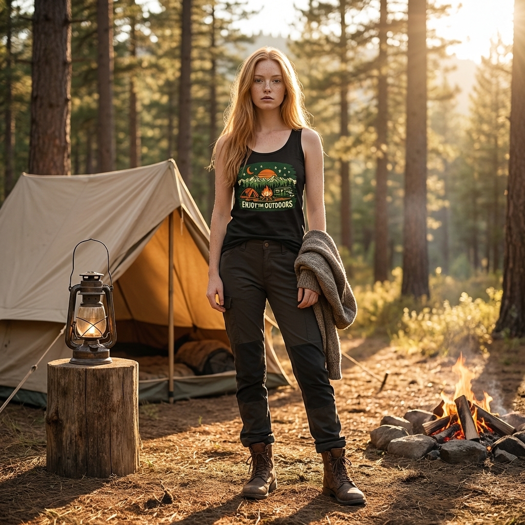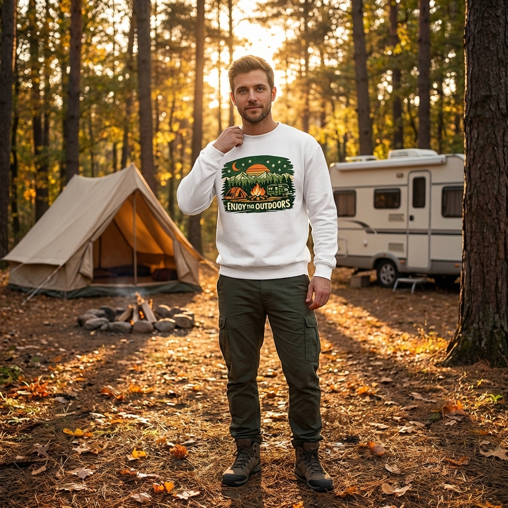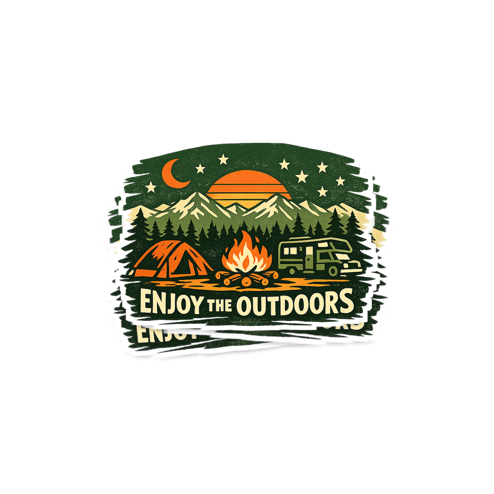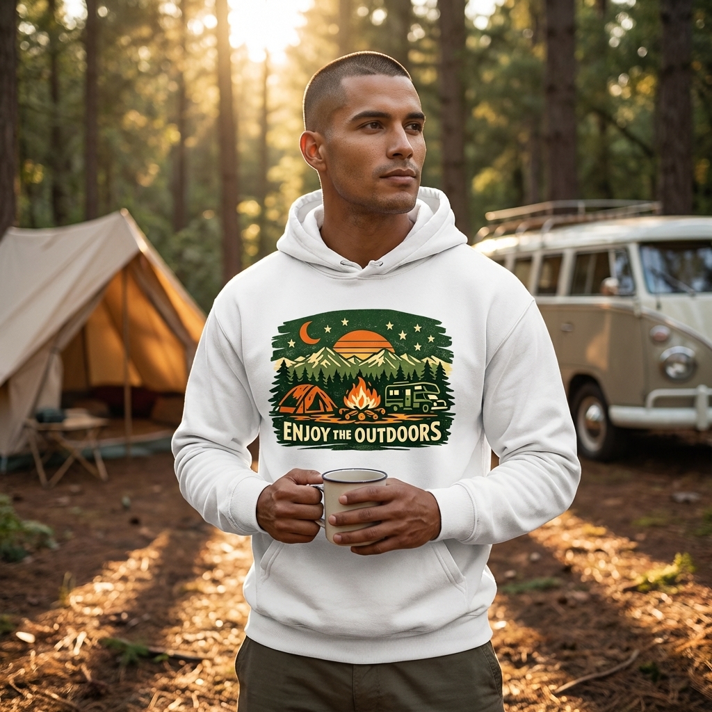 The 'Enjoy The Outdoors' phrase captures the lifestyle of passionate adventurers who spend their days camping, exploring mountain landscapes, and gathering around campfires.
