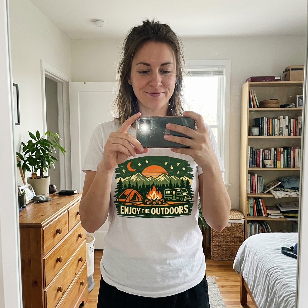Got this shirt today and wow, it's actually really soft. The abstract 'Enjoy The Outdoors' design looks even better in person; it's got a cool, laid-back vibe that's perfect for everyday wear. Super happy with it.