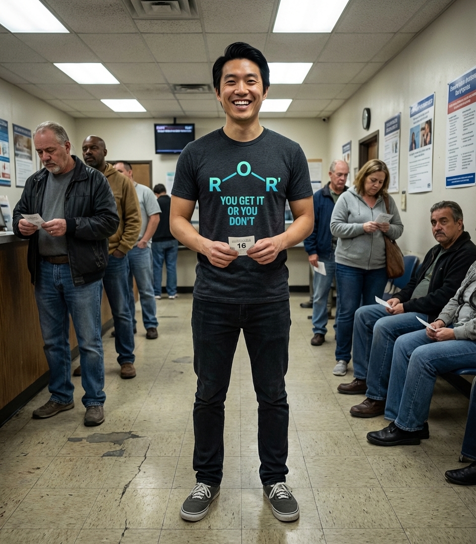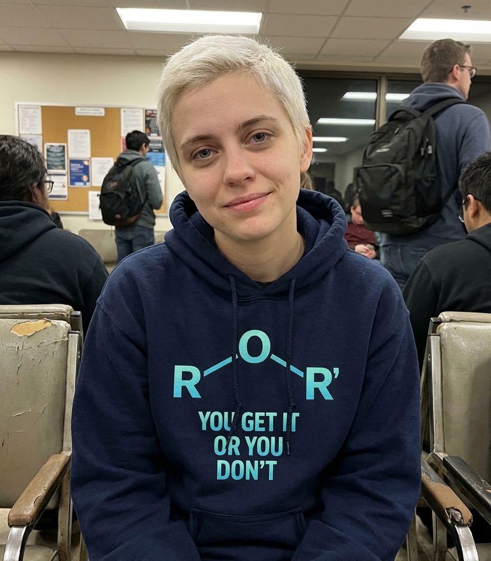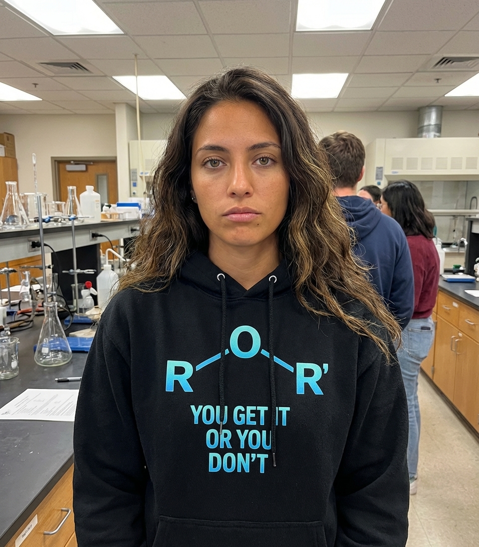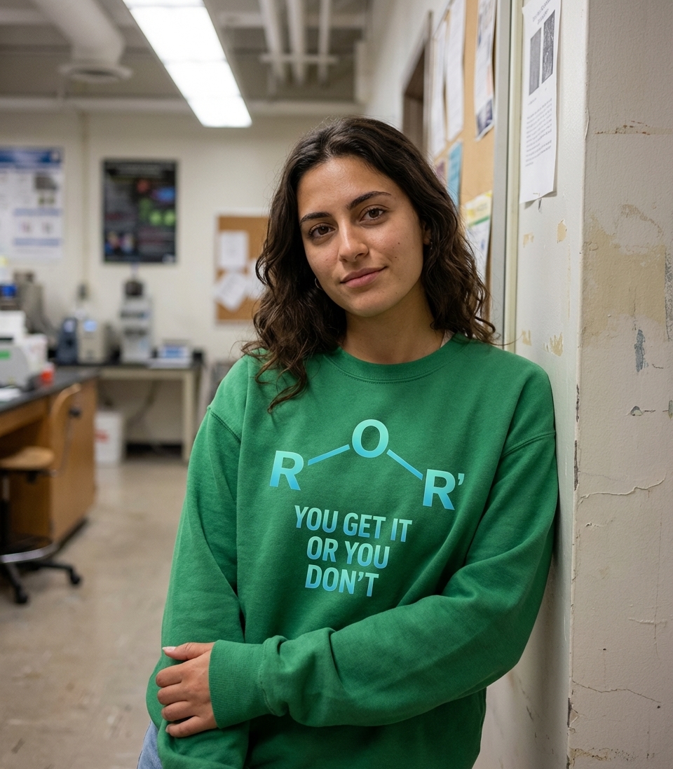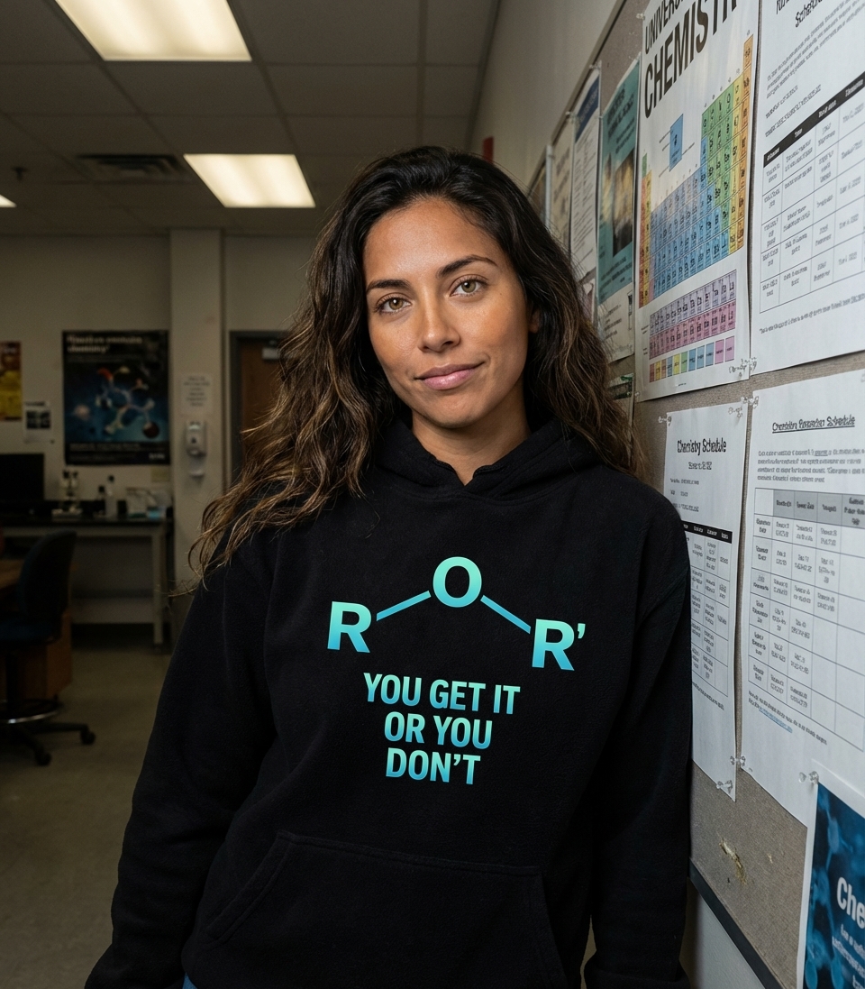 The R-O-R' phrase captures the lifestyle of clever science enthusiasts who enjoy organic chemistry, smart puns, and inside jokes.