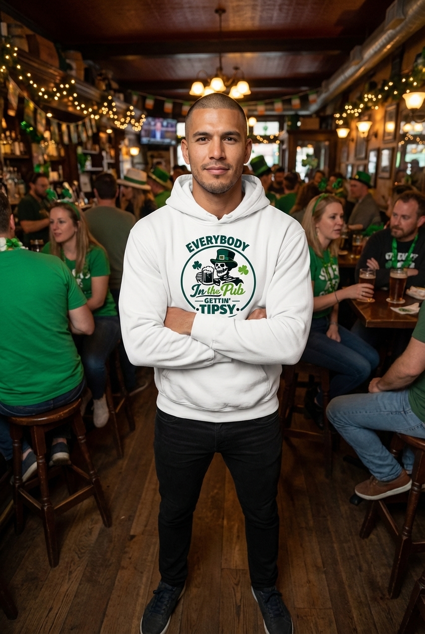 The 'Everybody Gettin' Tipsy' phrase captures the lively spirit of St. Patrick's Day enthusiasts who love to celebrate with friends, enjoy a pint, and embrace festive cheer.