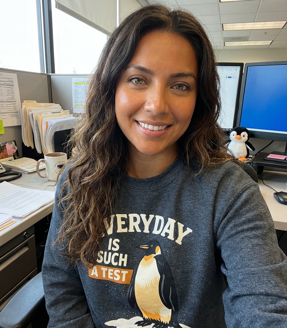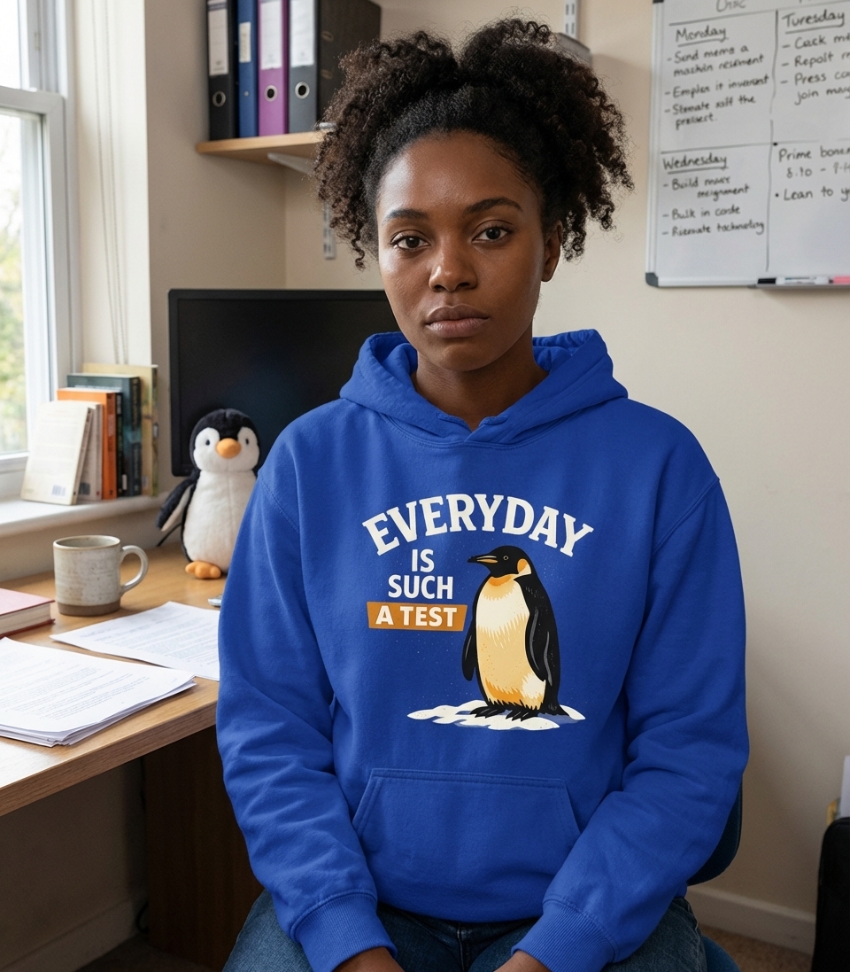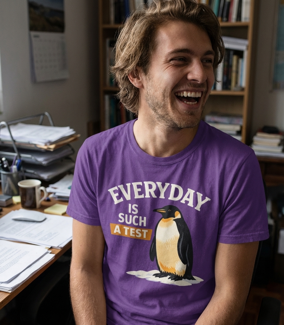 This graphic features a cool penguin standing on a snowy patch, set against a dark, subtle background. The prominent text "EVERYDAY IS SUCH A TEST" is displayed above the penguin, with "A TEST" highlighted in a contrasting orange box.