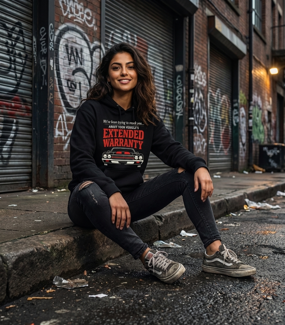 The "Extended Warranty" phrase captures the lifestyle of classic car enthusiasts and anyone who constantly gets those calls, sharing a laugh about persistent telemarketing.