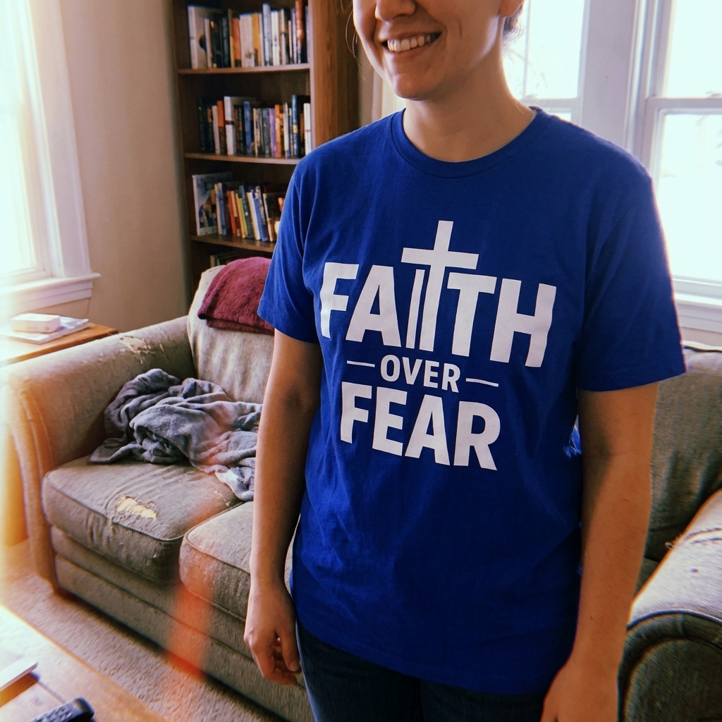 okay wow this tee is actually super comfy, love the material. the abstract cross design is really cool and subtle, perfect way to wear the 'faith over fear' message without being too loud. totally recommend!
