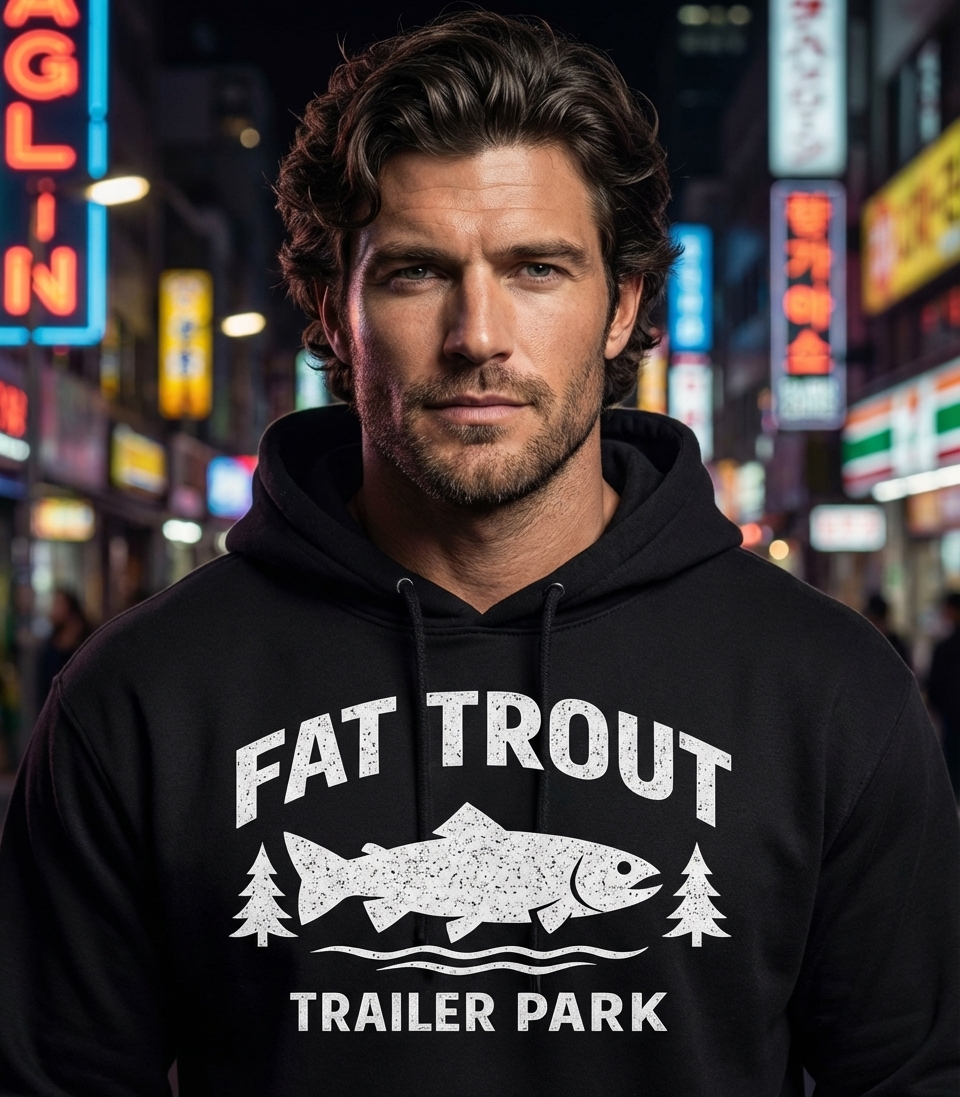 The 'Fat Trout Trailer Park' phrase captures the lifestyle of passionate anglers and outdoor enthusiasts who spend their days fishing, camping, and enjoying rustic getaways.