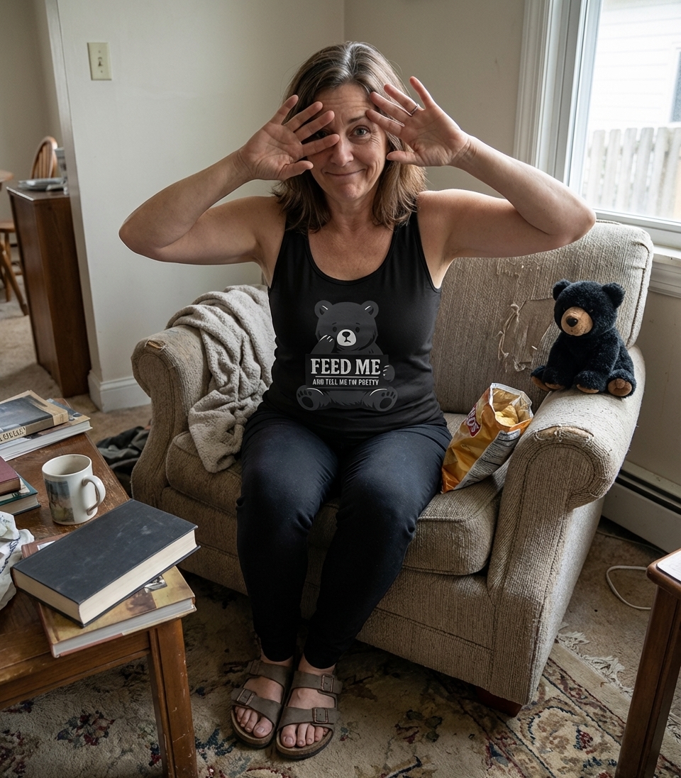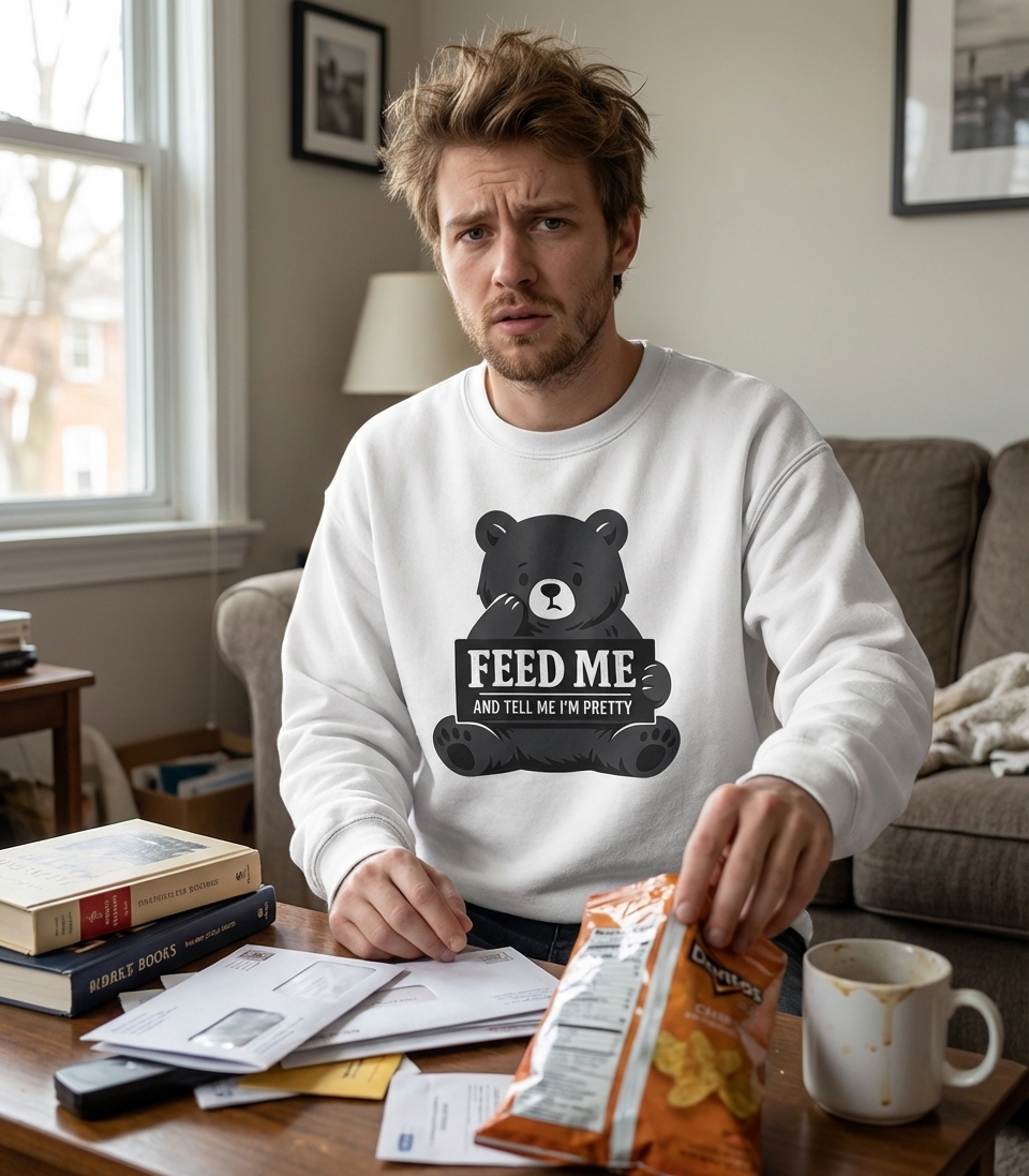 The "Feed Me And Tell Me I'm Pretty" phrase captures the lifestyle of anyone seeking comfort, affection, and a good laugh.