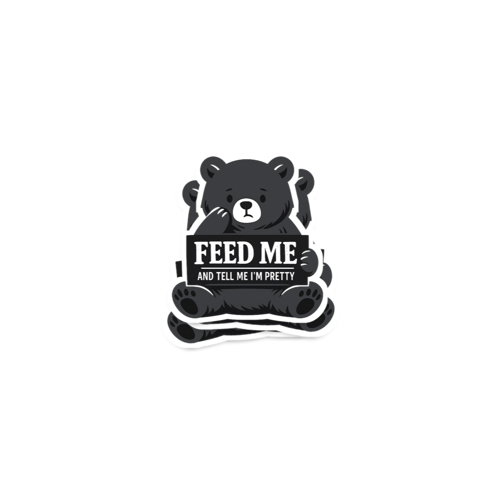 The artwork features a minimalist, flat graphic of a cartoon bear with a slightly melancholic expression. The text "FEED ME AND TELL ME I'M PRETTY" is presented in a bold, sans-serif font for "FEED ME" and a slightly smaller, more delicate font for "AND TELL ME I'M PRETTY," enhancing the humorous contrast. The monochromatic palette of dark grey and white on a black background creates a stark yet appealing visual, emphasizing the bear's earnest plea. The overall mood is one of lighthearted self-pity and relatable charm.