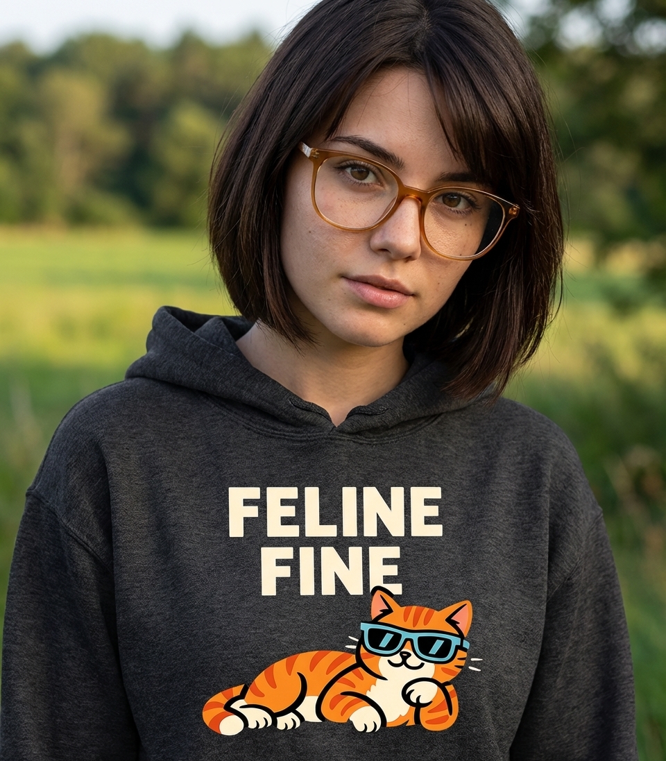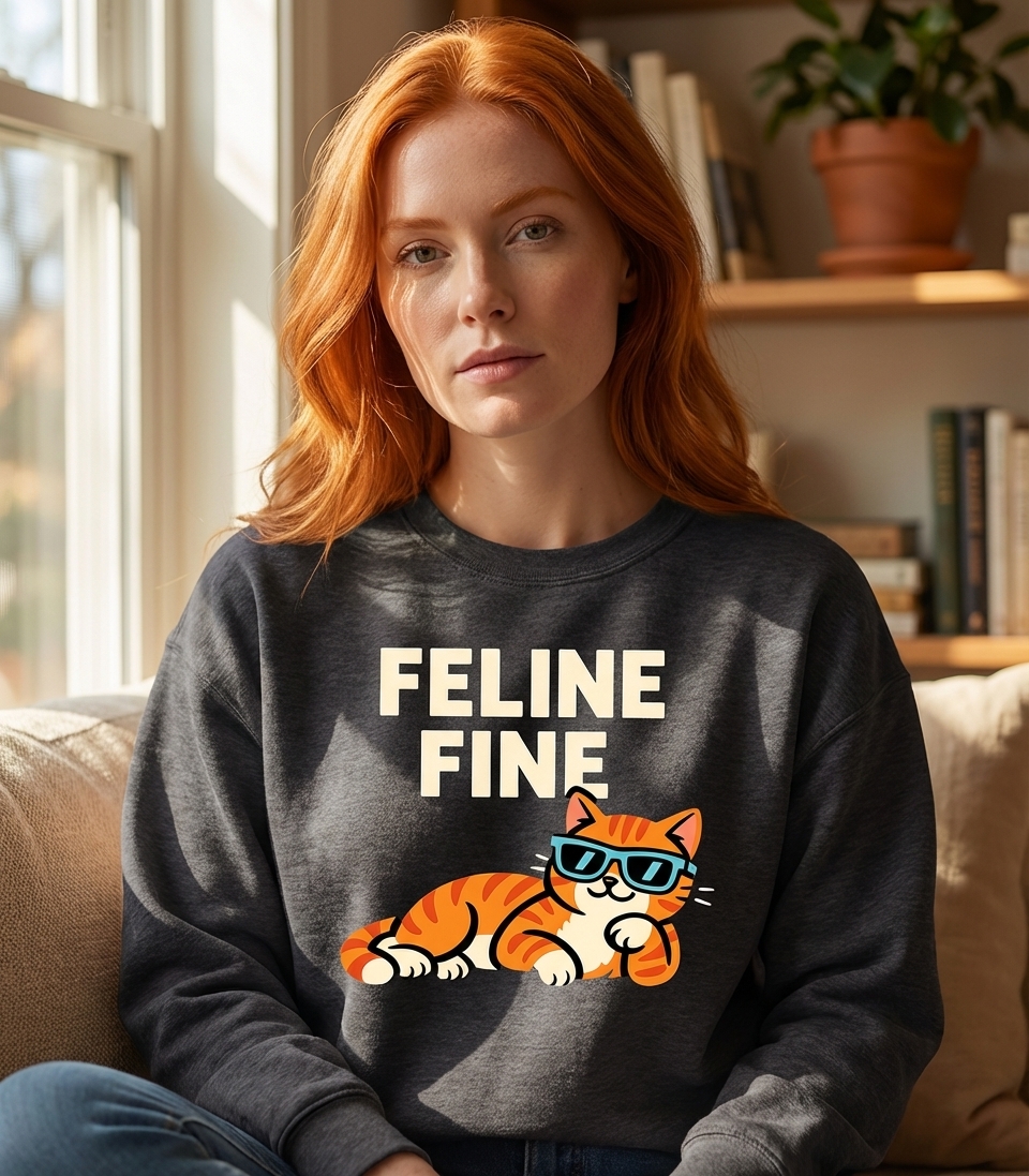 The 'Feline Fine' phrase captures the lifestyle of laid-back cat lovers who enjoy puns, chill vibes, and showing off their cool feline style.
