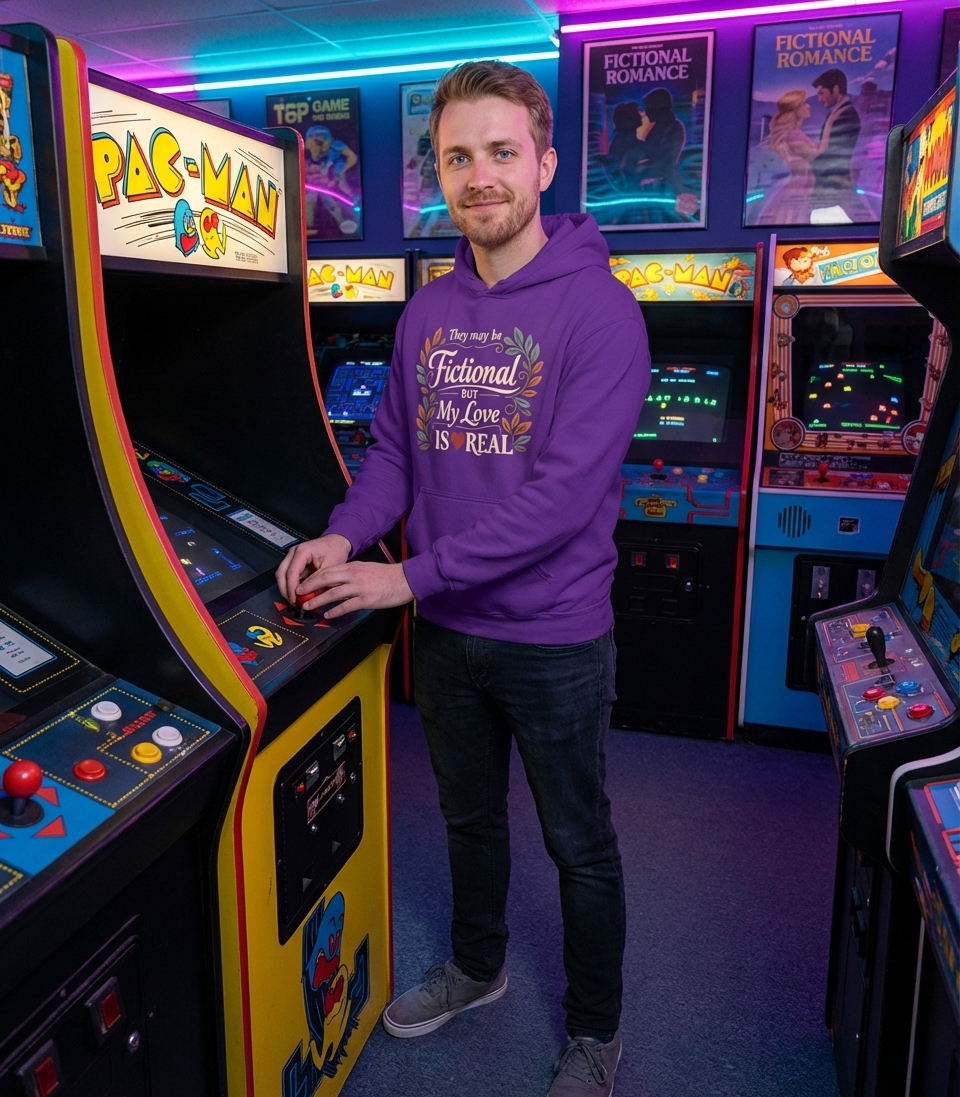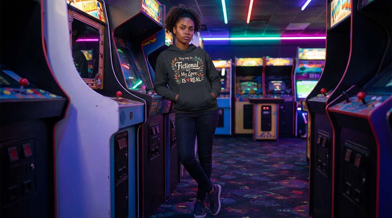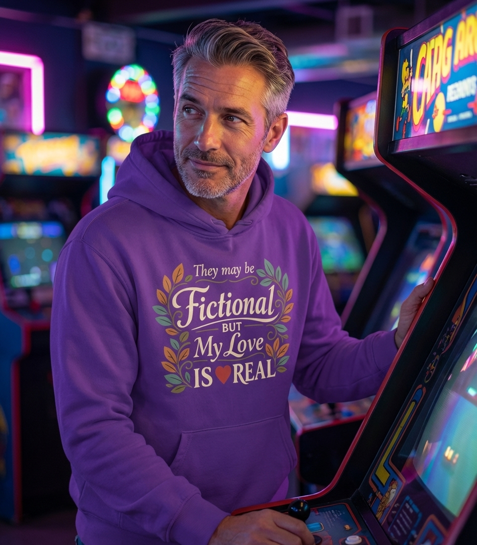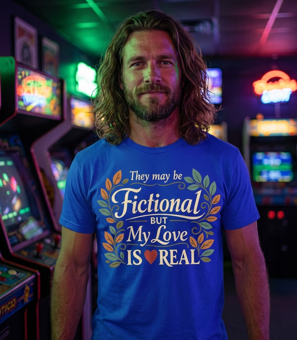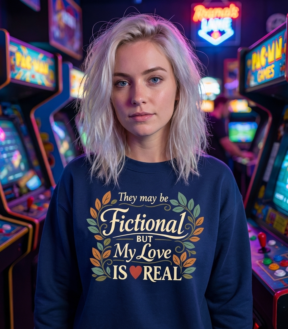 The "Fictional Love Is Real" phrase captures the lifestyle of passionate fans who spend their days reading captivating stories, binge-watching beloved series, and immersing themselves in imaginative worlds.