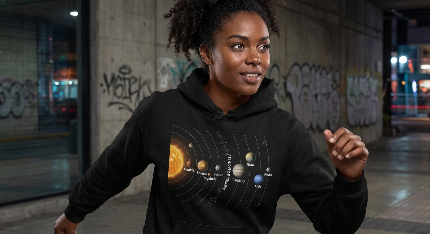 This design celebrates the diverse fictional planets that capture the imaginations of passionate sci-fi and fantasy fans across countless universes.