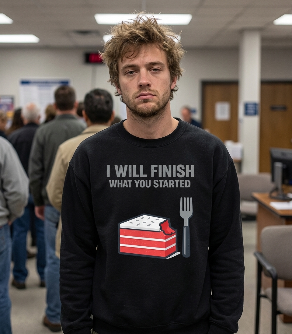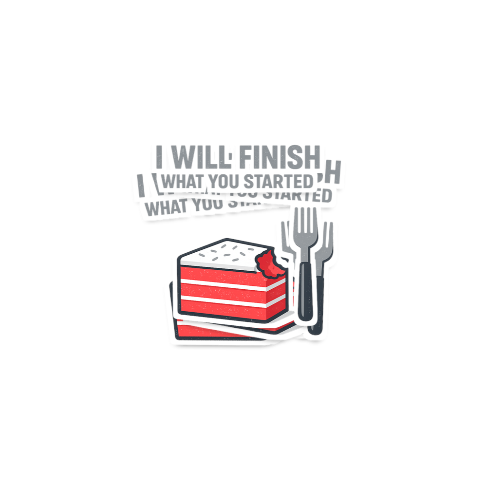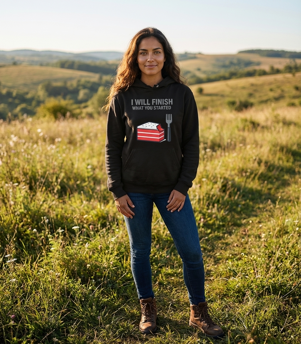 The 'I Will Finish What You Started' phrase captures the lifestyle of passionate foodies who love dessert, hate waste, and enjoy a good laugh.