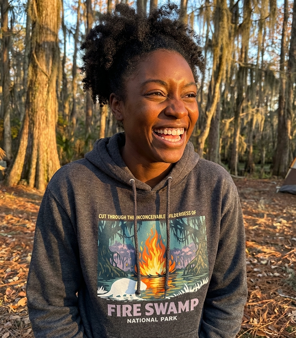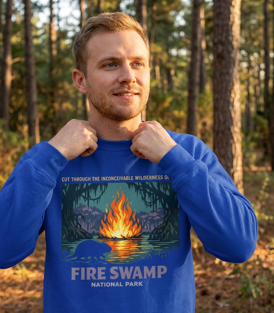 The 'Fire Swamp National Park' design captures the whimsical spirit of adventurers who love exploring unique fictional landscapes, enjoy camping, and appreciate retro travel art.