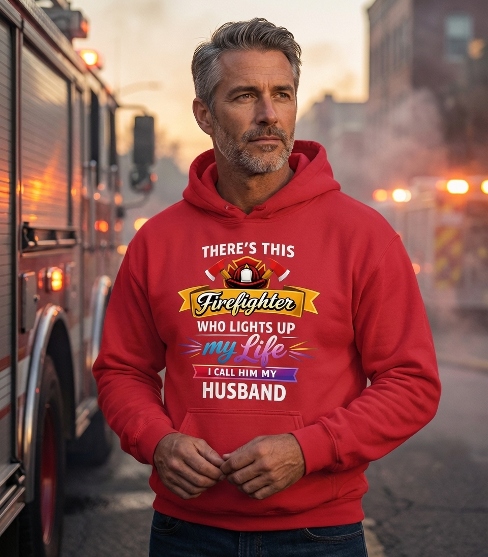 The phrase "There's this Firefighter who lights up my Life, I call him my Husband" is a heartfelt declaration of love and admiration. It signifies that the wearer's husband is not only a brave first responder but also the source of happiness and illumination in their personal world.
