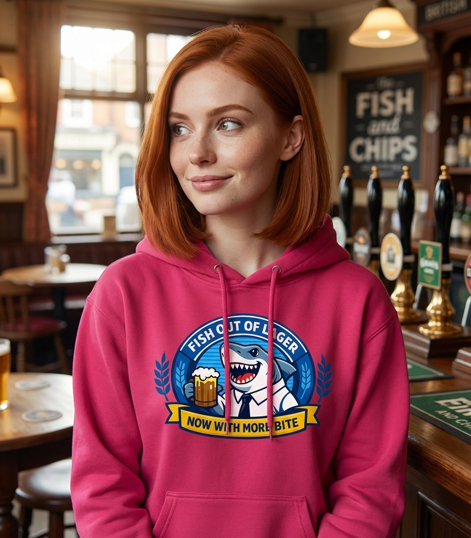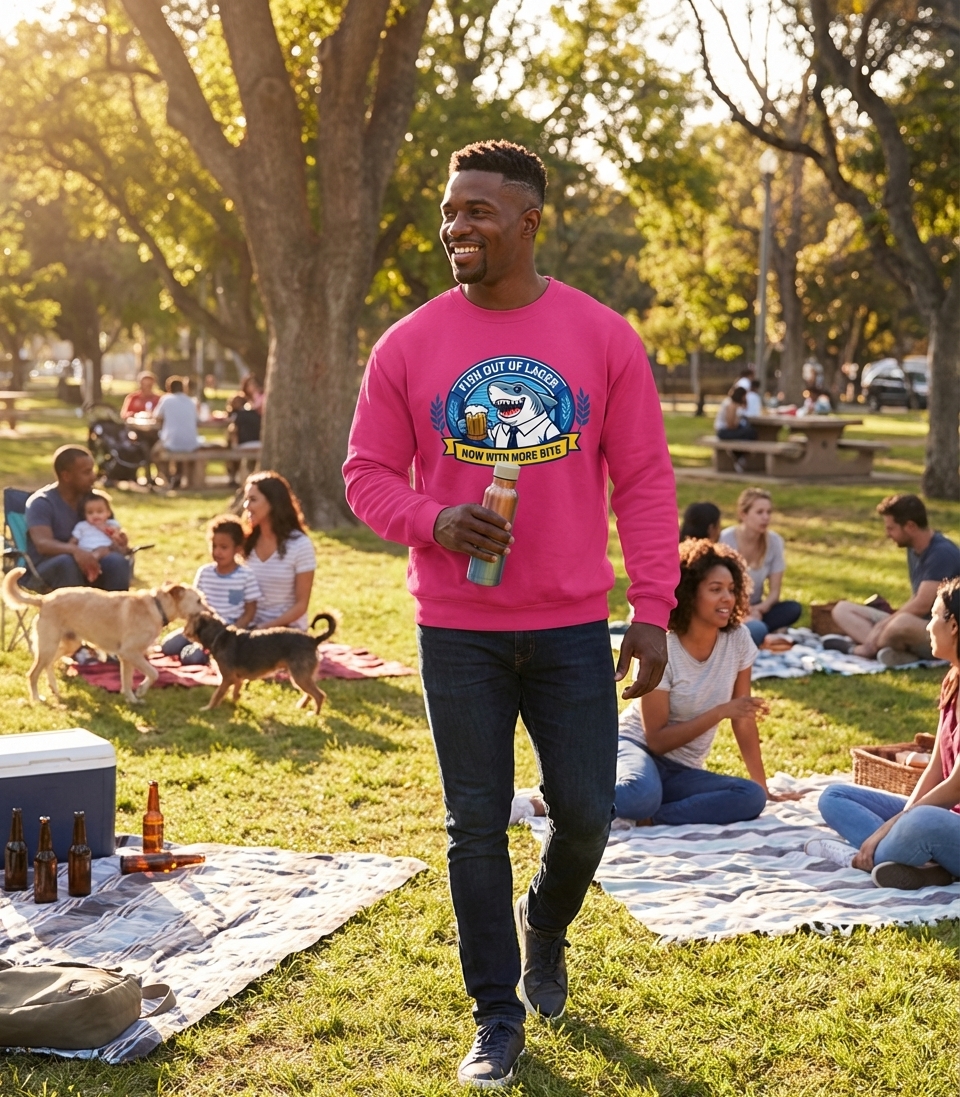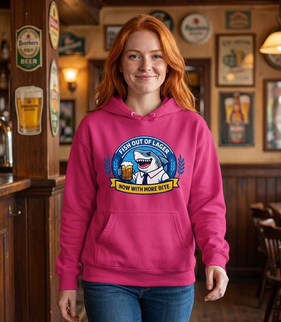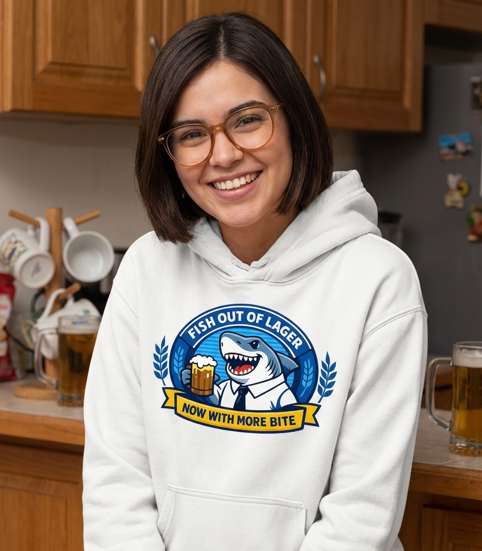 The 'Fish Out of Lager' phrase captures the lifestyle of spirited beer enthusiasts who enjoy clever puns, craft brews, and good company.