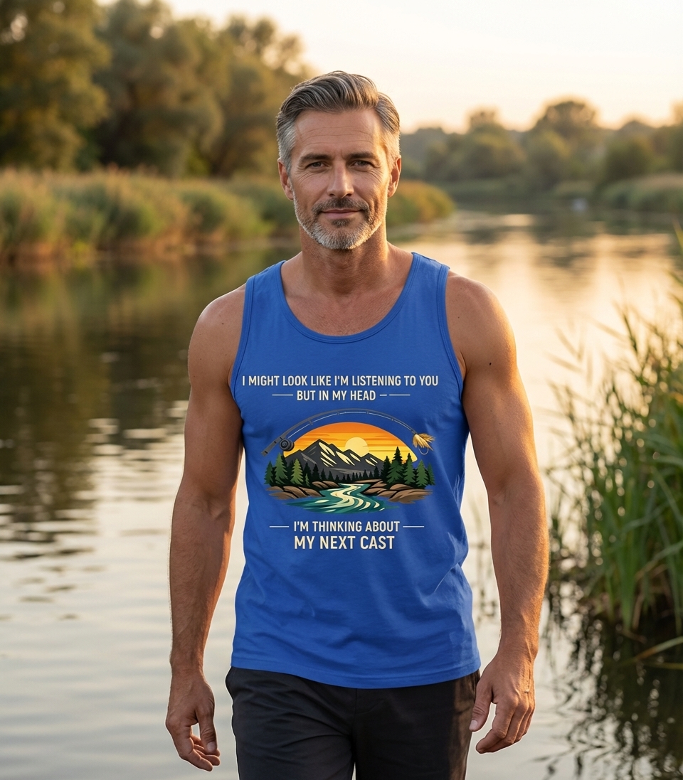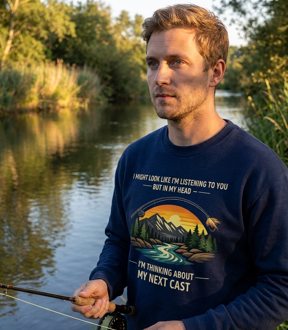 The 'Thinking About My Next Cast' phrase captures the lifestyle of passionate anglers who spend their days fishing, planning their next move, and enjoying the tranquility of nature.