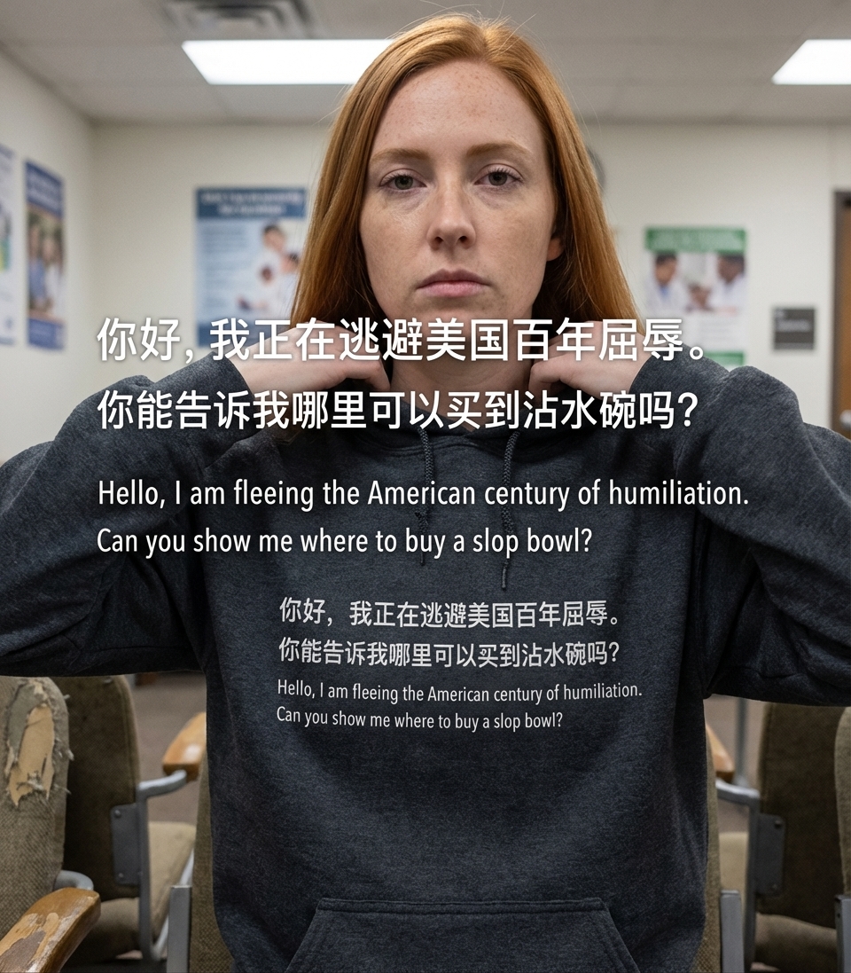 This design features a profound statement in both Chinese and English, expressing a desire to flee what the text refers to as the "American century of humiliation." The graphic is text-based and direct, aiming to provoke thought and conversation about global political perspectives.