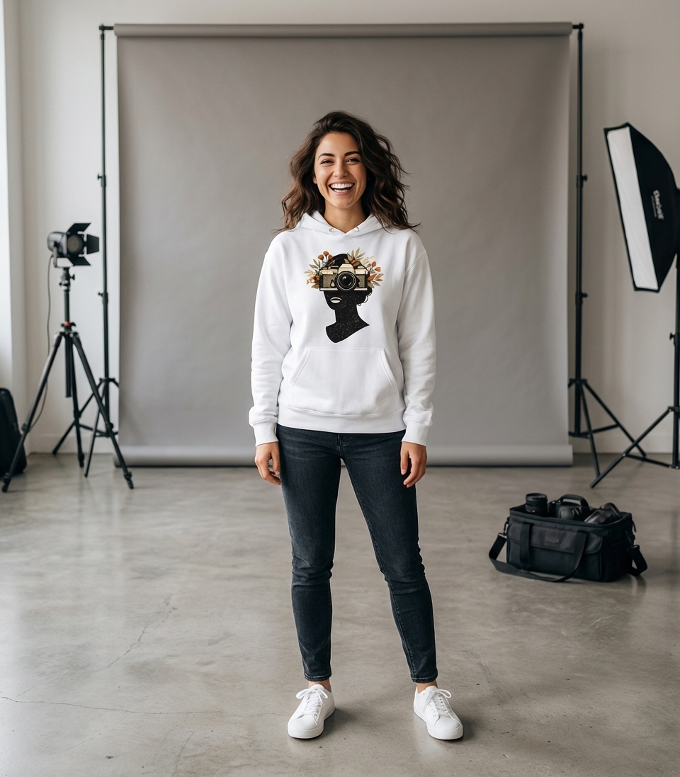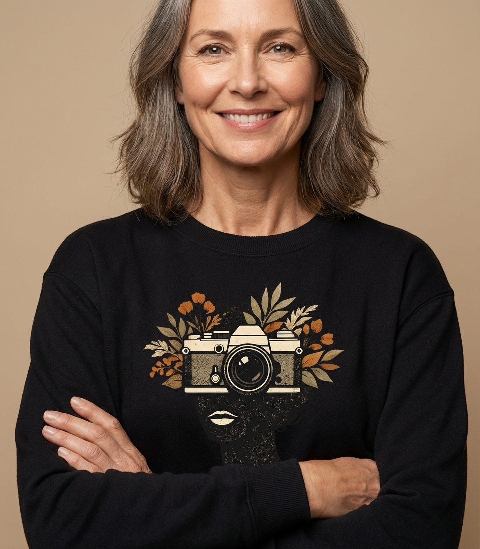 This unique t-shirt artwork features the elegant silhouette of a person, with a classic vintage camera placed where the face would be. Adorned with delicate autumnal leaves and blossoms, it merges the art of photography with the beauty of the natural world. The distressed texture adds a timeless, artistic touch to the overall composition.