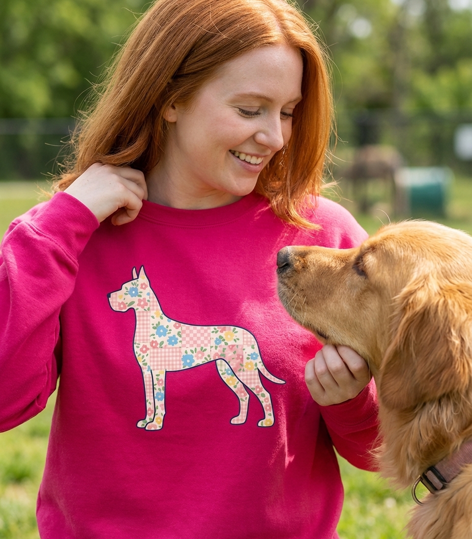 The floral patchwork Great Dane design captures the sweet and loving spirit of devoted dog owners who cherish their gentle giants.