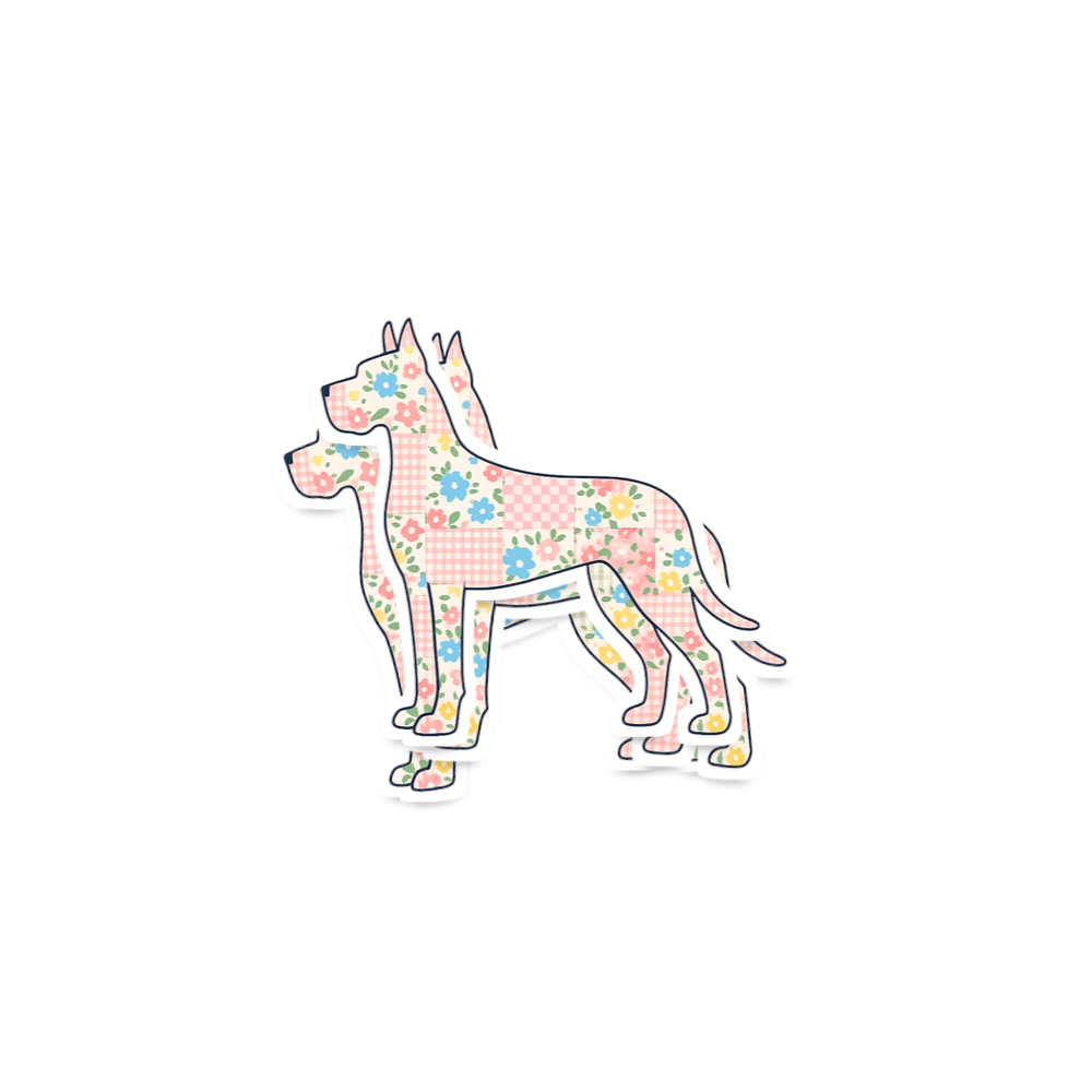 This unique design features the elegant silhouette of a Great Dane, filled with a charming patchwork pattern. The pattern combines delicate floral prints in soft pastel colors with classic pink gingham checks, creating a whimsical and artistic representation of the beloved dog breed.
