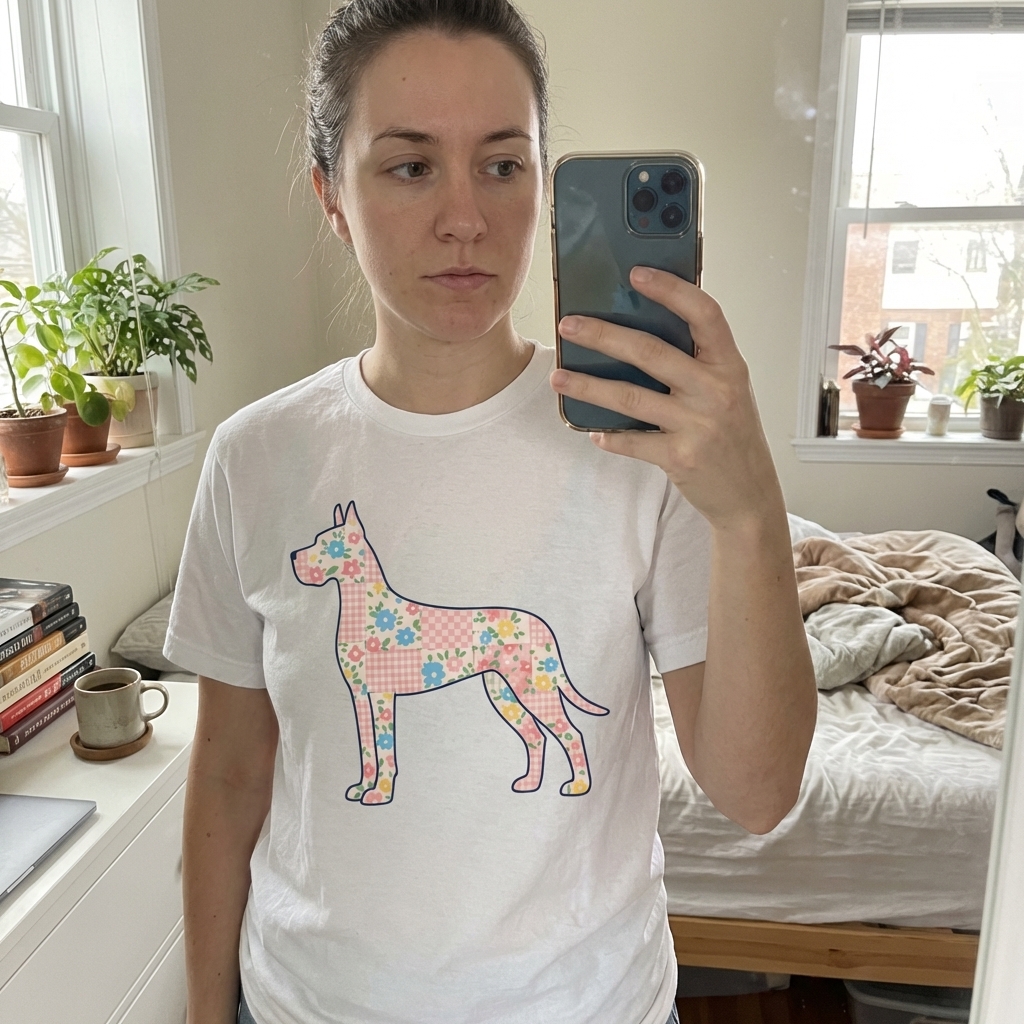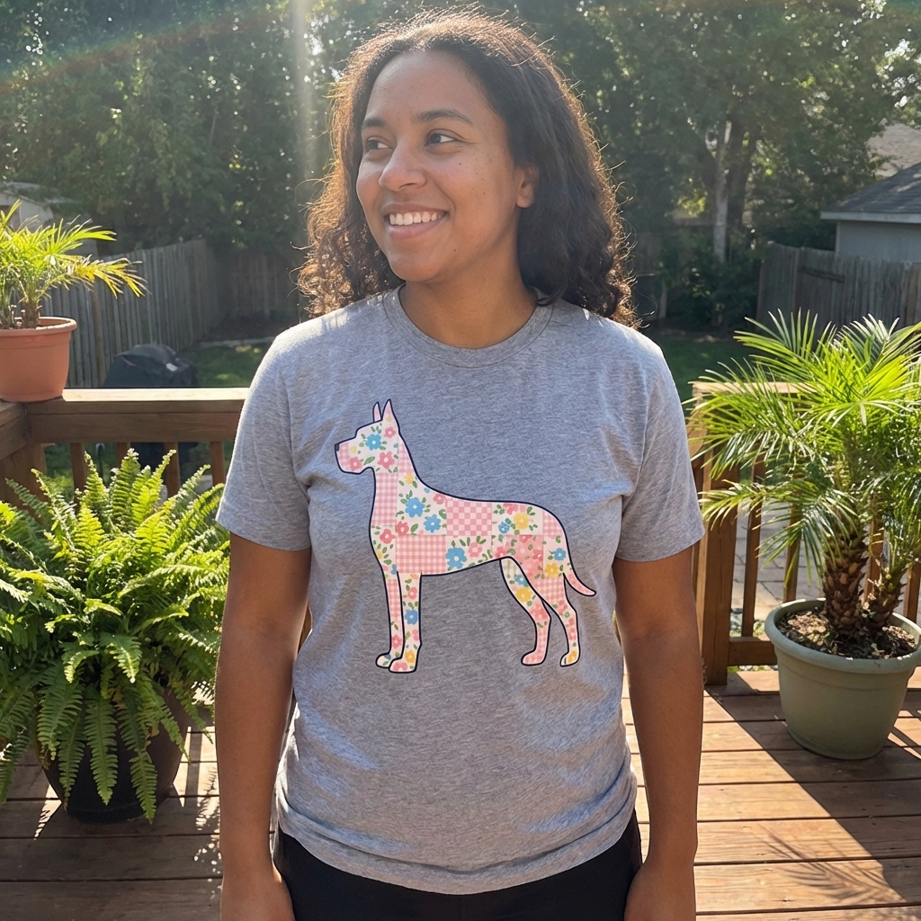 Okay, this 'Floral Great Dane' shirt is seriously cute and really unique. The fabric is super soft, too – definitely my new go-to for comfy, stylish days out.