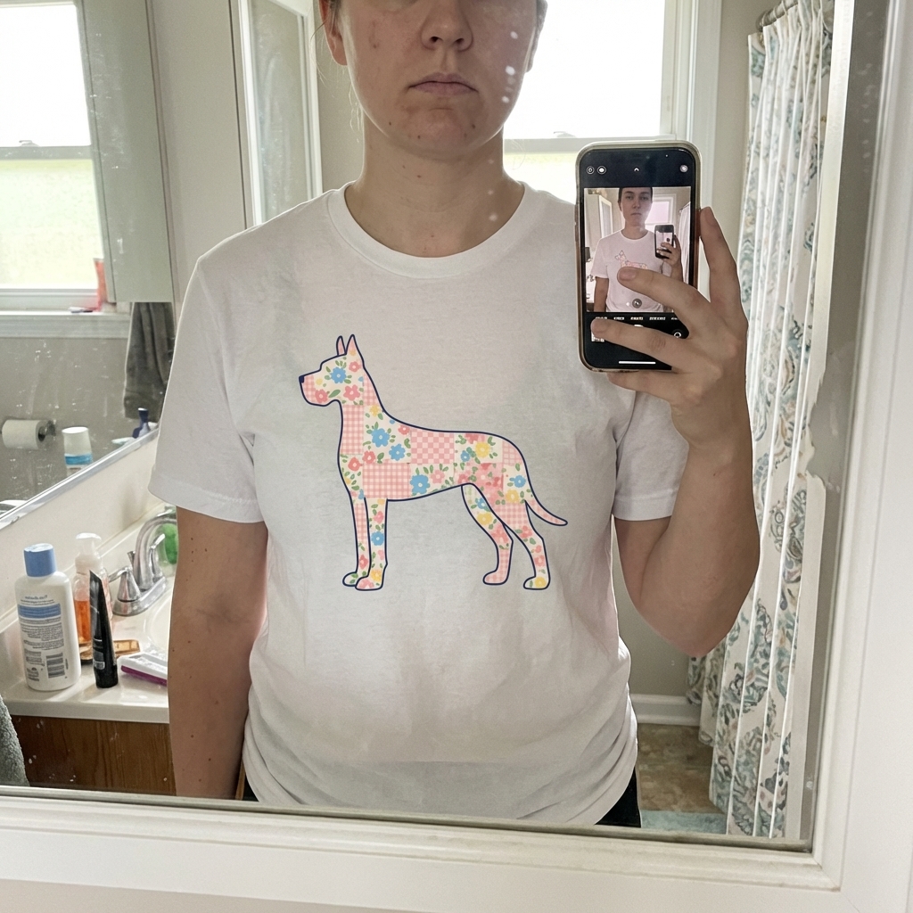 Okay, seriously loving this shirt. The floral great dane design is such a cool vibe, really unique without being over the top, and the material feels super nice. Definitely a new favorite!