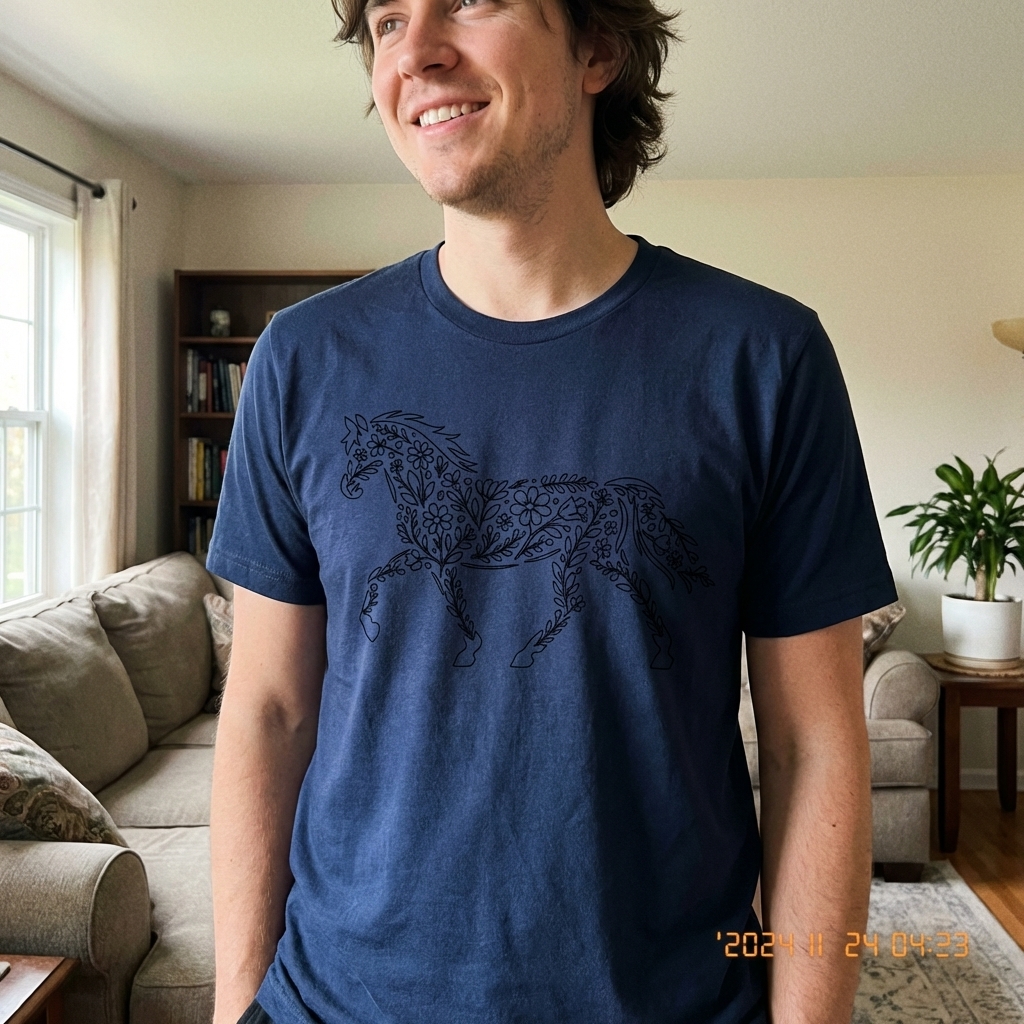 This unique t-shirt design features a striking horse silhouette. The majestic form of the horse is intricately filled with an elegant pattern of white flowers and leaves.
