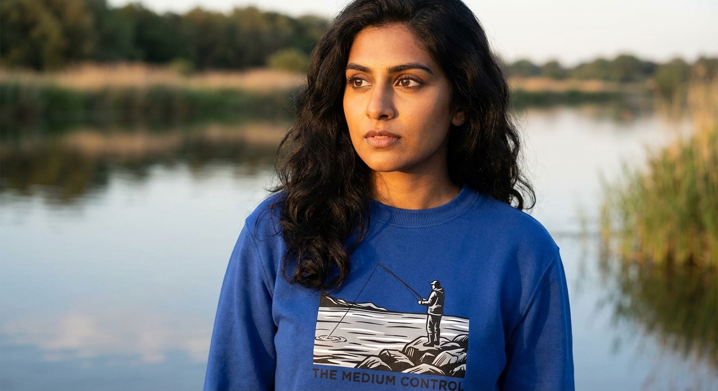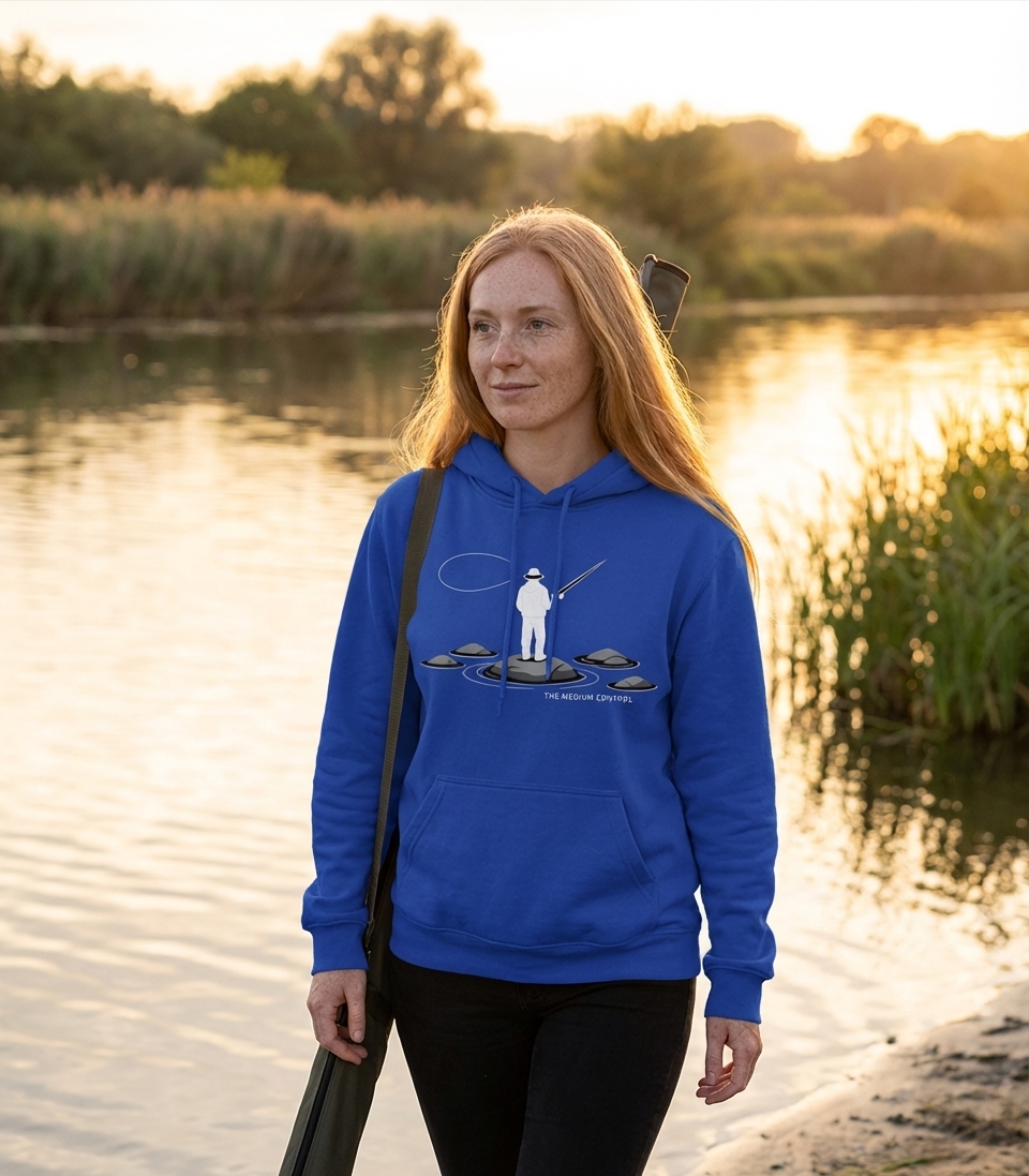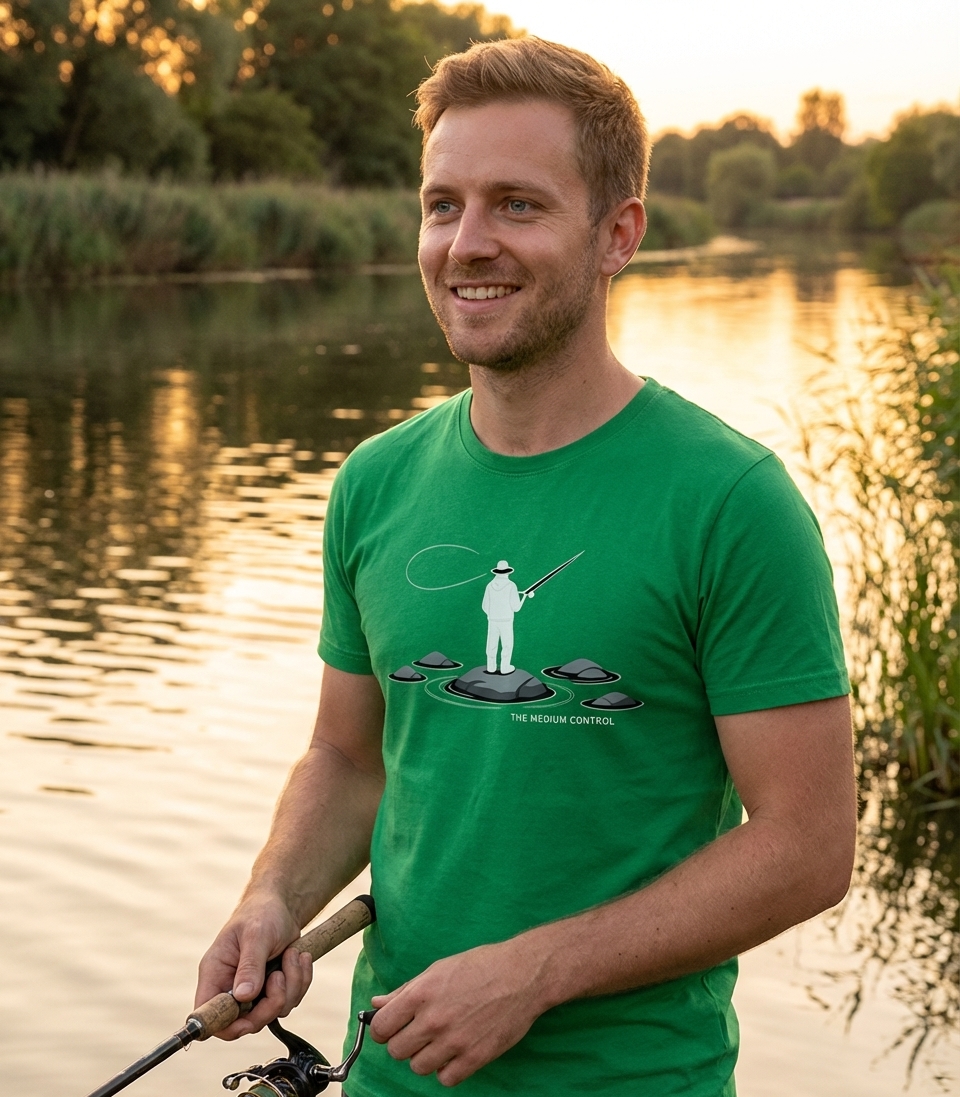 The 'Medium Control Fishing' phrase captures the lifestyle of passionate anglers who find peace and precision in casting their lines in serene waters.