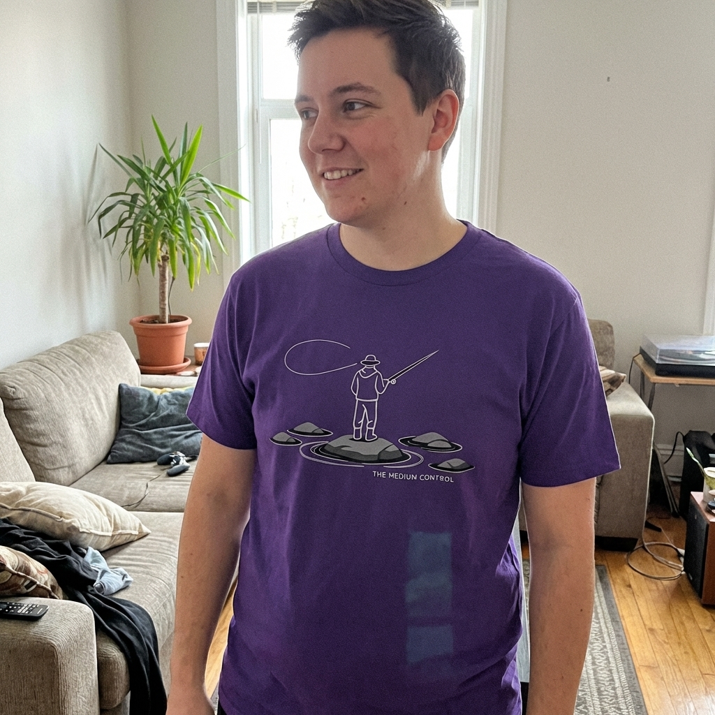 got my 'medium control fisherman' tee today and it's even better in person. the design is kinda subtle but really interesting, definitely has a cool vibe without being too loud. plus, it's really comfy, perfect for just chilling out.