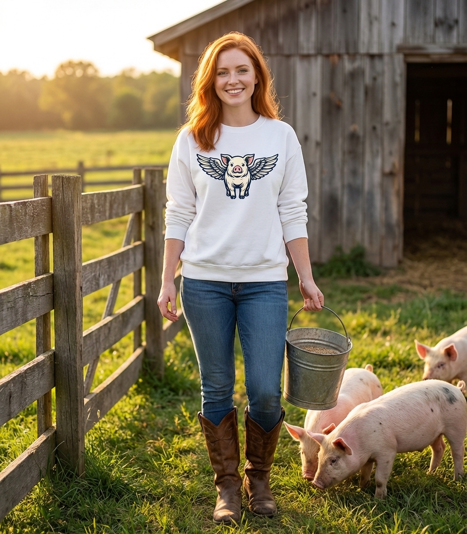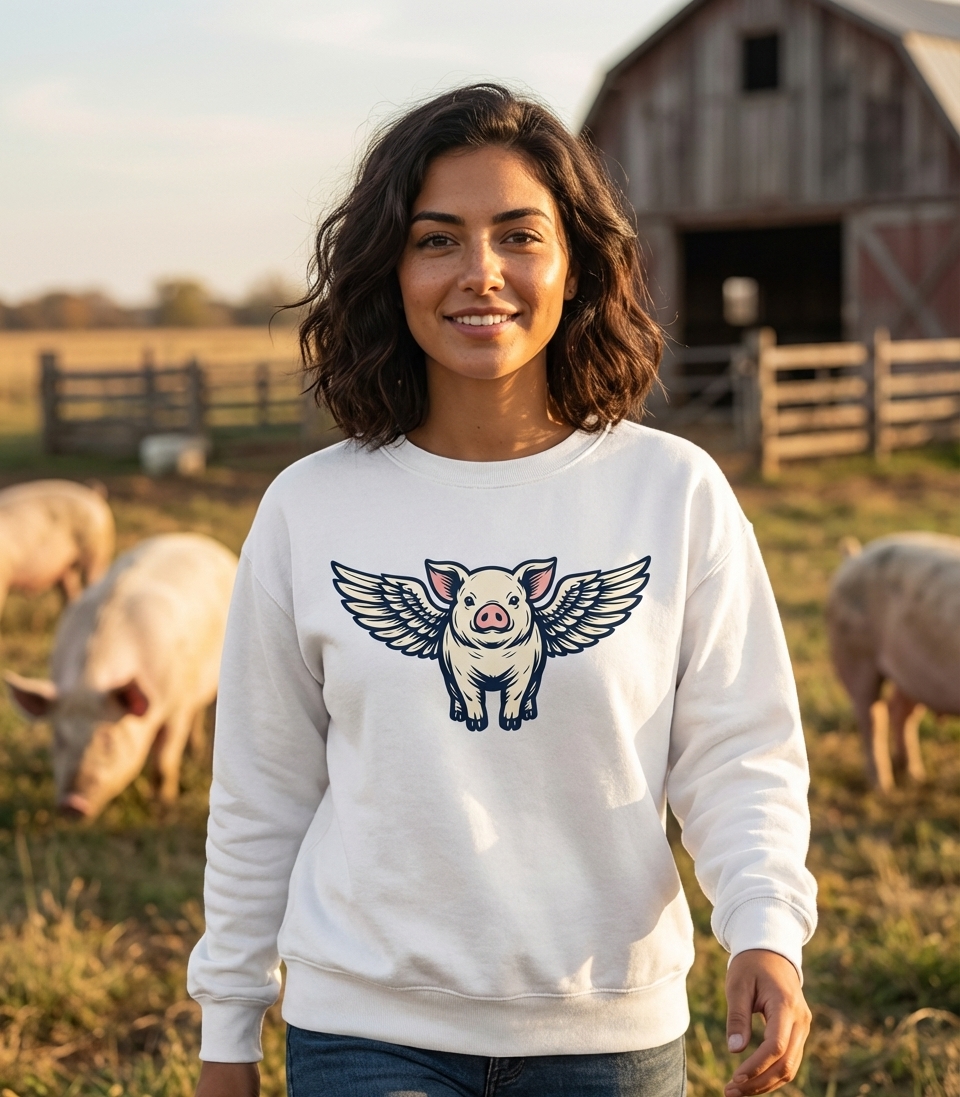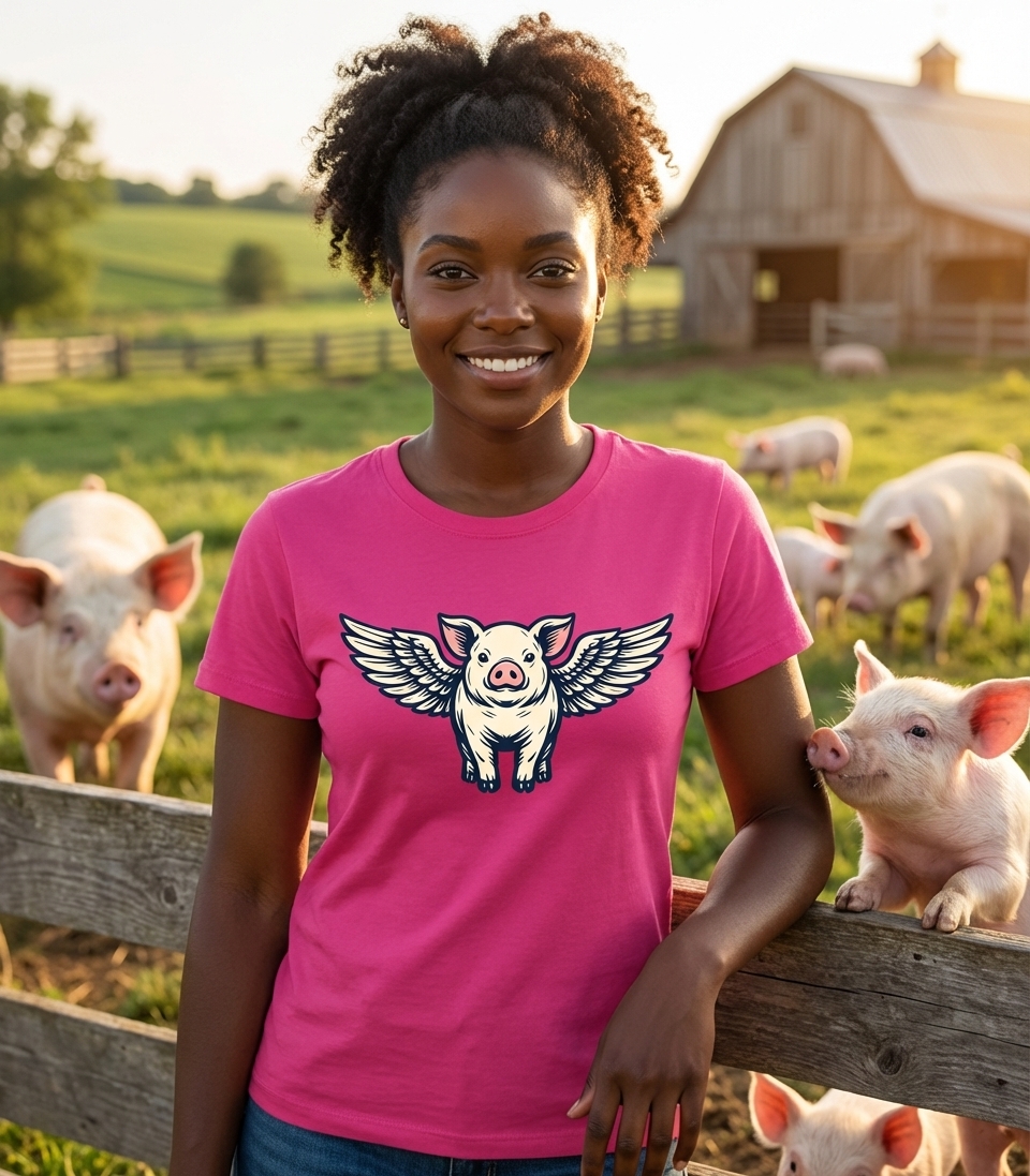 This unique graphic features an adorable pig, complete with majestic wings, soaring through the air. The charming illustration blends a classic farm animal with a touch of fantasy, creating a whimsical and eye-catching image.